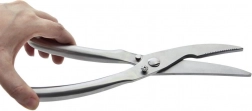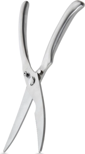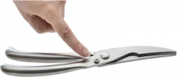 Te nerjavninske škarje za perutnino olajšajo razkosavanje kuhanega, pečenega in surovega mesa. Ostra in nazobčana rezila zanesljivo prerežejo kožo, meso in manjše kosti, medtem ko ergonomska celokovinska ročaja zagotavljata udoben in siguren oprijem. Zahvaljujoč varnostni zapori jih lahko varno shranite in imate vedno pri roki.