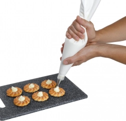 Vrečka je čvrsta in prožna, dobro leži v roki in je enostavna za upravljanje. Univerzalna velikost ustreza različnim tipom jeklenih nastavkov, zato lahko ustvarjate detajle od nežnih linij do izrazitih dekoracij. Po uporabi jo preprosto operete – primerna za pomivalni stroj.
