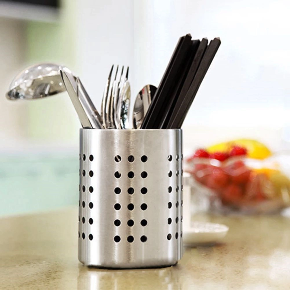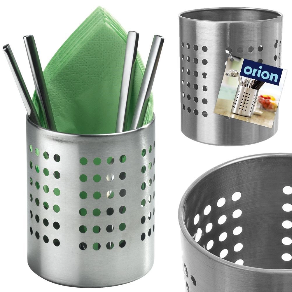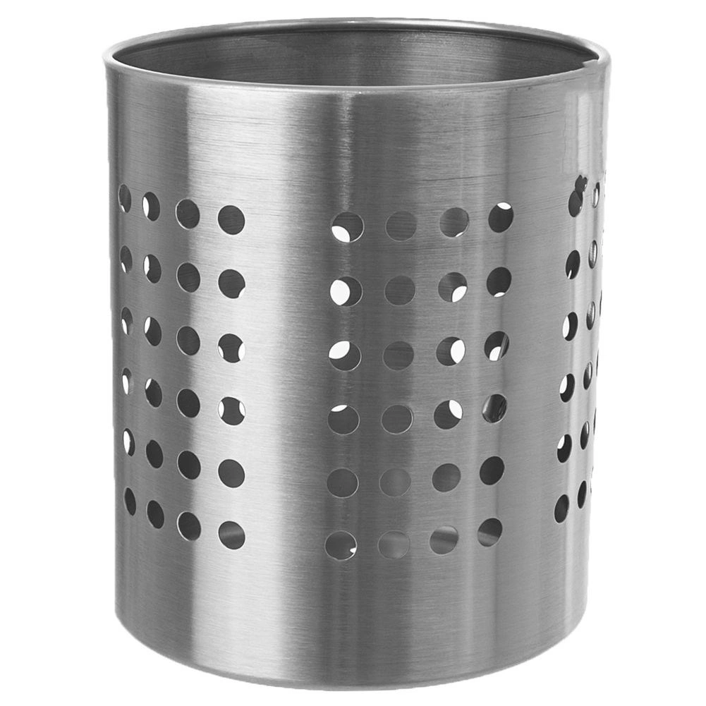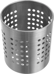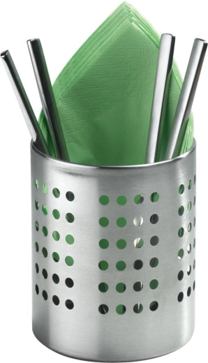 Praktično nerjavno stojalo za pribor in kuhinjske pripomočke s premerom 12 cm in višino 13 cm. Zahvaljujoč perforiranim odprtinam zagotavlja odvajanje vode in cirkulacijo zraka, zato se pribor hitreje suši in ostane higiensko čist. Odporna nerjavna jekla v srebrni barvi, univerzalna uporaba kot kapalo in organizator ter klasična zasnova, ki se poda vsaki kuhinji.