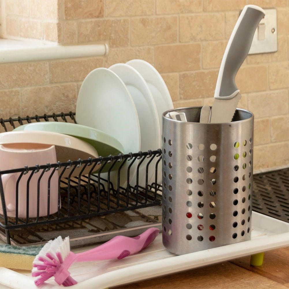 Ohranite red na kuhinjskem pultu s tem čvrstim in elegantnim stojalom iz nerjavnega jekla. Perforirana konstrukcija pospešuje sušenje in preprečuje nabiranje vlage, zato je idealna za odlaganje opranega pribora in kuhinjskih orodij. Preprosto za čiščenje in zahvaljujoč široki odprtini omogoča udobno shranjevanje večjih in manjših pripomočkov.