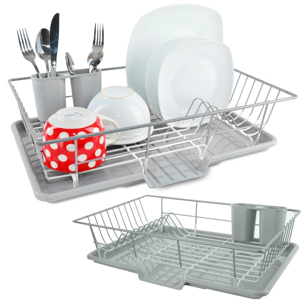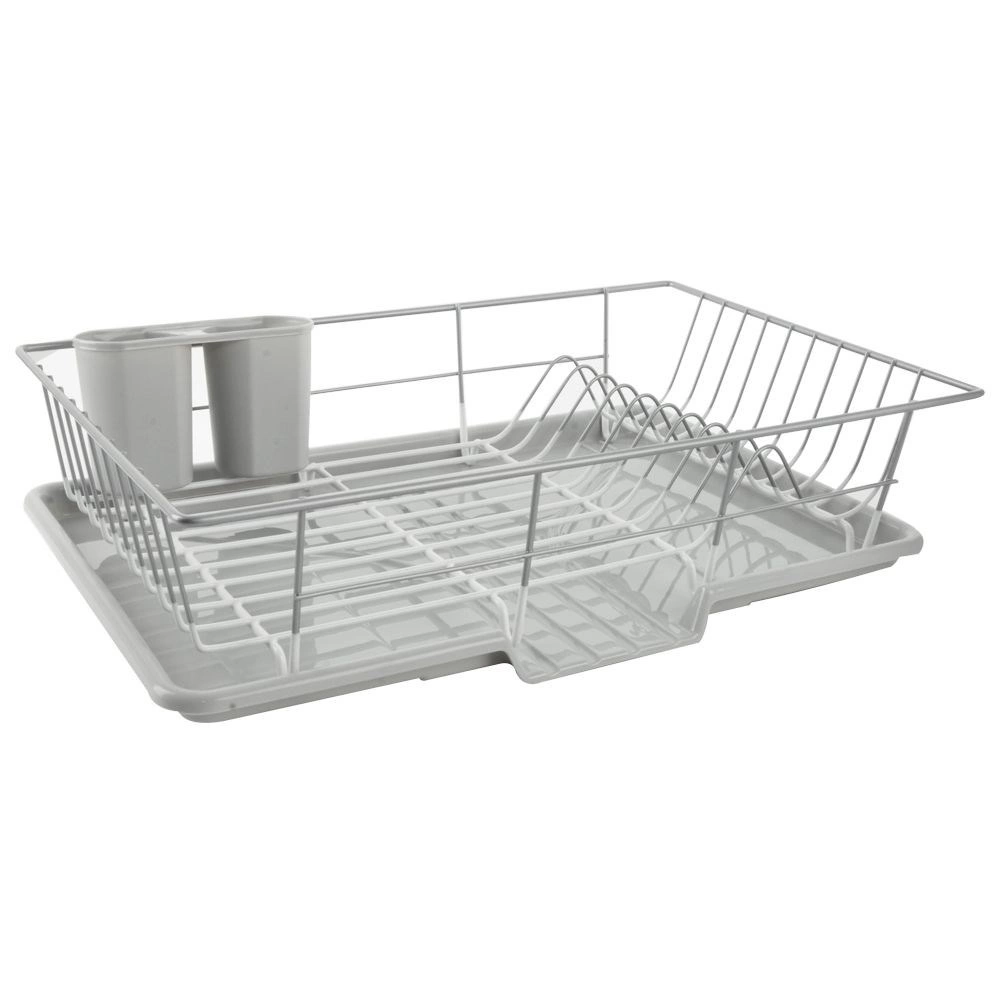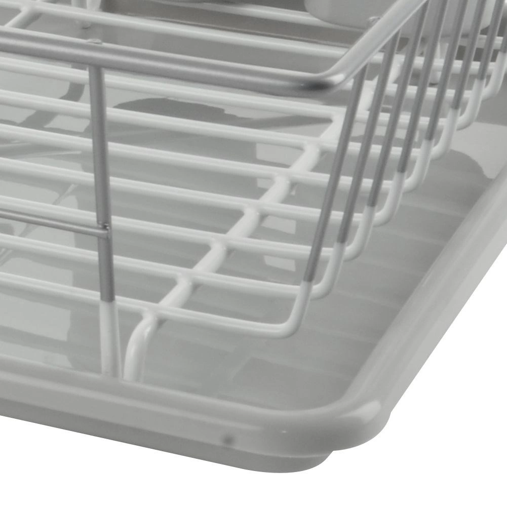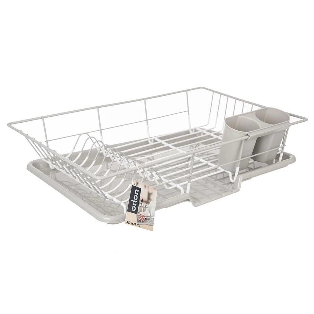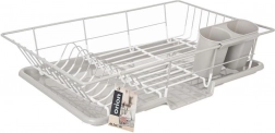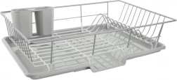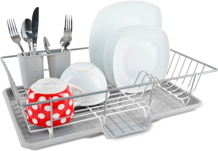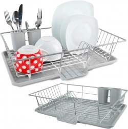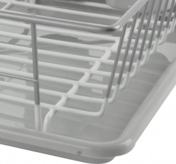 Eleganten in praktičen odkapnik za posodo z merami 46,5 × 31 × 13 cm omogoča udobno sušenje krožnikov, skodelic, kozarcev in pribora, ne da bi se voda nabirala na kuhinjskem pultu. Kovinska konstrukcija iz nerjavnega jekla s sivobelo zaščitno površinsko obdelavo je stabilna, odporna proti koroziji in enostavna za čiščenje.
