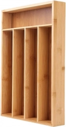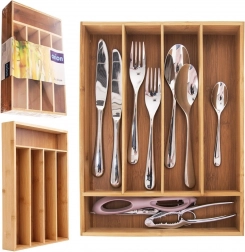 Organizator ponuja pet praktičnih predalčkov: štiri ožje za jedilni pribor in enega širšega za kuhinjske pripomočke, kot so lupilec, odpirač za vino ali oreholomilec. Univerzalne mere 35 × 26 × 5 cm olajšajo namestitev v običajne predale in zagotavljajo pregledno razdelitev vsebine. Čiščenje je enostavno – dovolj je, da ga obrišete z vlažno krpo.