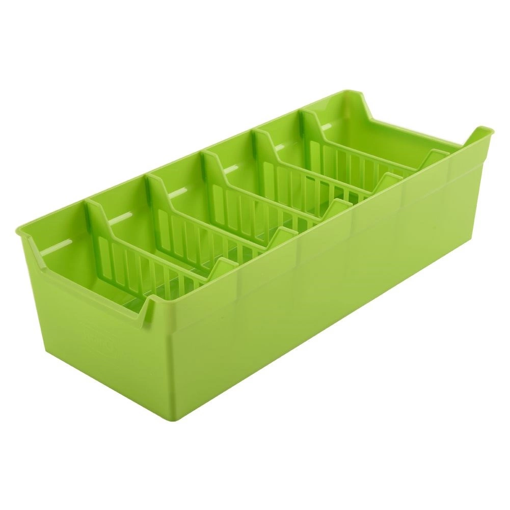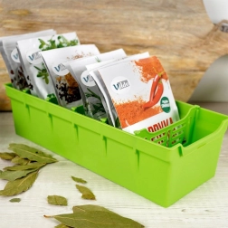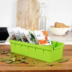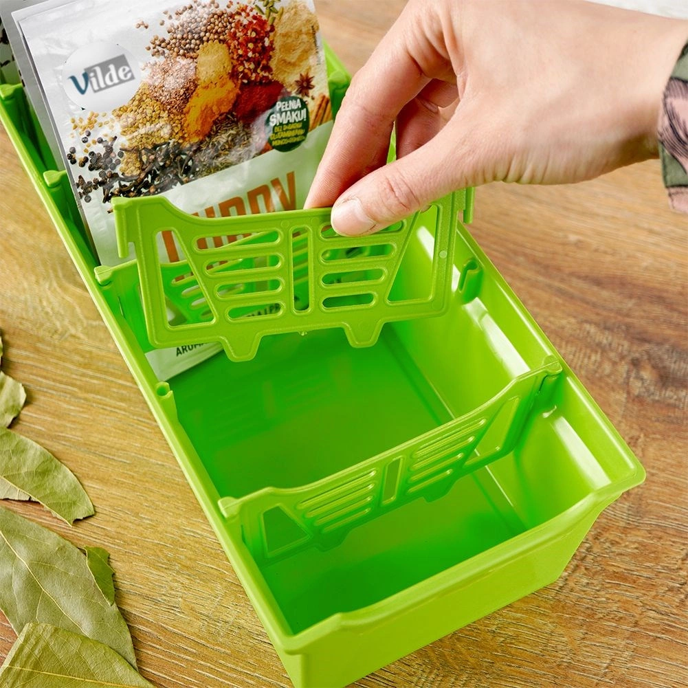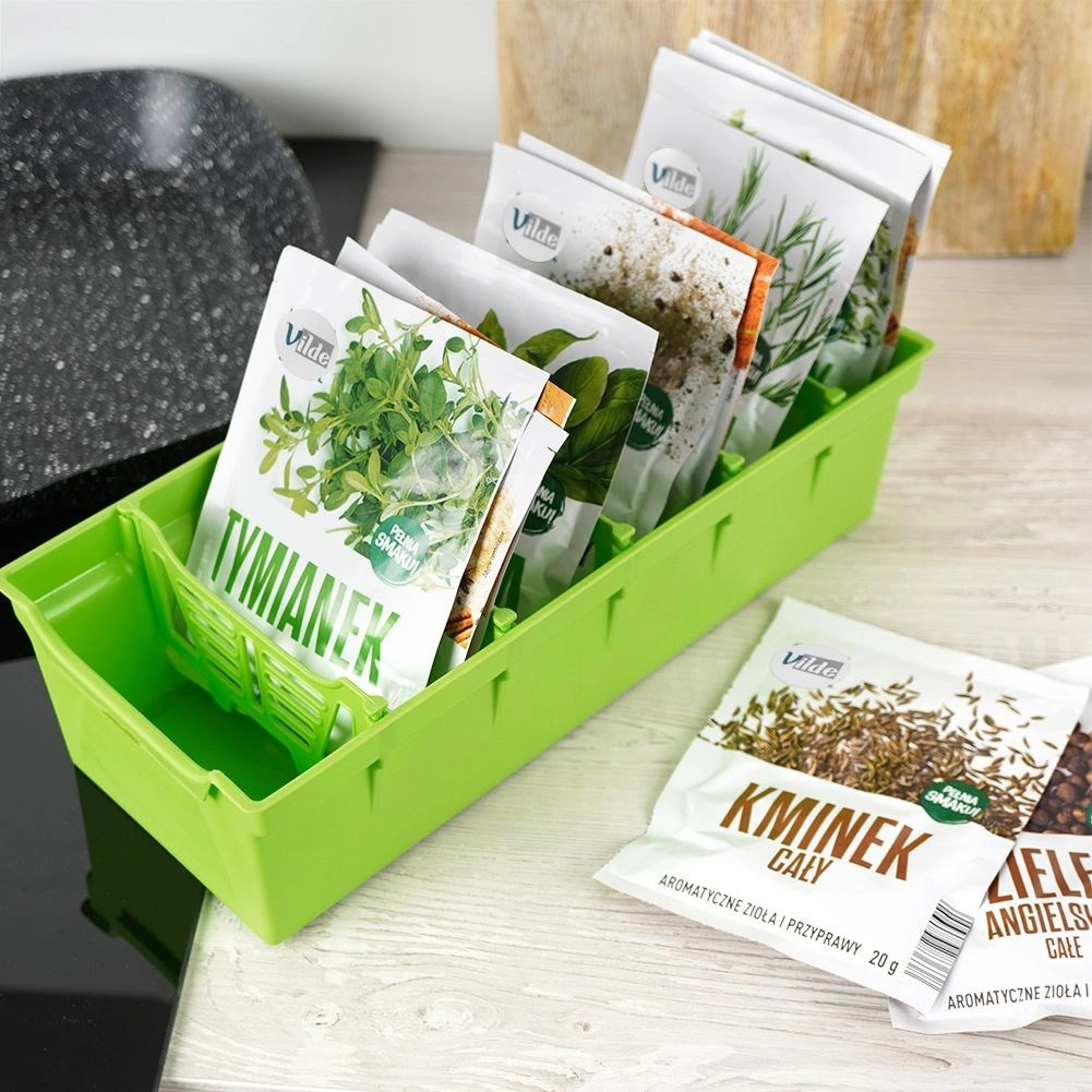 Uredite si zelišča in začimbe pregledno ter elegantno. Zeleni organizator za začimbe je idealen za shranjevanje vrečk z začimbami – bodisi odprtih ali zaprtih. V notranjosti je pet odstranljivih pregrad, ki razdelijo škatlo na šest delov, zato boste imeli dovolj prostora in preglednosti za vsakodnevno kuhanje.
