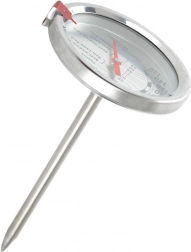 Zanesljiv kuhinjski termometer z nerjavno sondo 12 cm meri neposredno v notranjosti mesa in zagotovi, da bodo pečenke, perutnina in steak-i pripravljeni natančno tako, kot imate radi. Čitljiv analogni številčnik omogoča hiter odčitek temperature v razponu 50–90 °C, idealno za večino vrst mesa in toplih jedi.