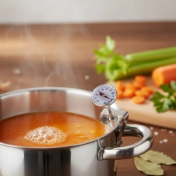 Razpon merjenja -10 °C do +100 °C pokriva večino kuhinjskih opravil: od segrevanja mleka in otroških jedi, preko priprave domače šunke, juh in sirupov, do nadzora temperature pri pečenju ali žaru. Nerjavno jeklo je higiensko, odporno in enostavno za čiščenje, zato je termometer odličen tako za domačo kot tudi profesionalno uporabo.