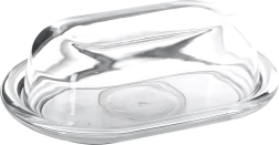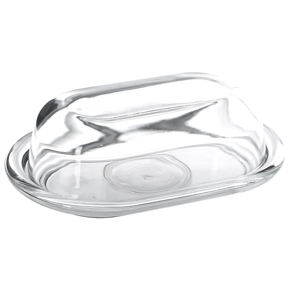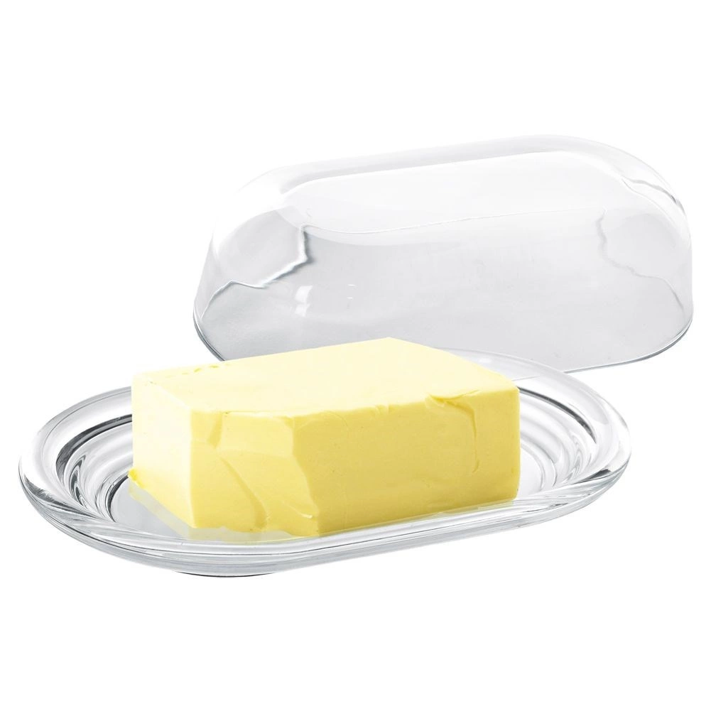 Čisto steklo in oblikovano dno omogočata elegantno serviranje ter hitro vizualno kontrolo količine masla v hladilniku ali na mizi.