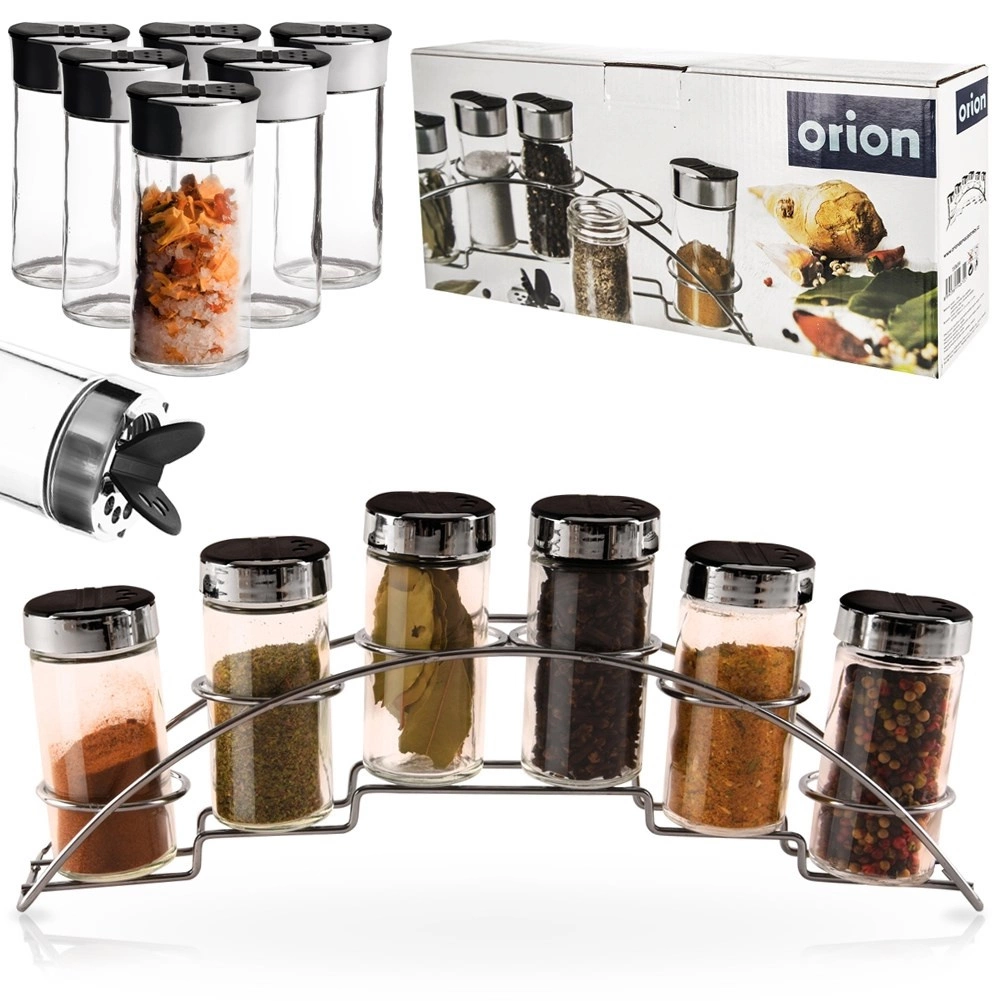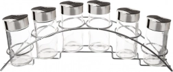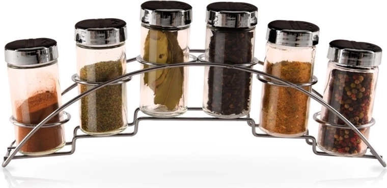 Ukrivljeno kovinsko stojalo drži vse kozarčke pregledno in stabilno, zato imate pogosto uporabljene začimbe vedno udobno na voljo na kuhinjskem pultu.