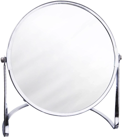 Elegantno dvostransko kozmetično ogledalo na stojalu s srebrnim okvirjem je idealno za ličenje in vsakodnevno nego. Ponuja klasičen prikaz in 2× povečavo, ima premer ogledalne površine 17 cm ter deluje stilsko in minimalistično v vsakem interierju.