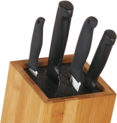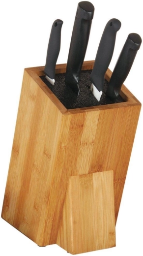 Poševen oblikovni rez in kompaktna osnova prihranita prostor, nože držita navpično in zagotavljata takojšen dostop med kuhanjem.