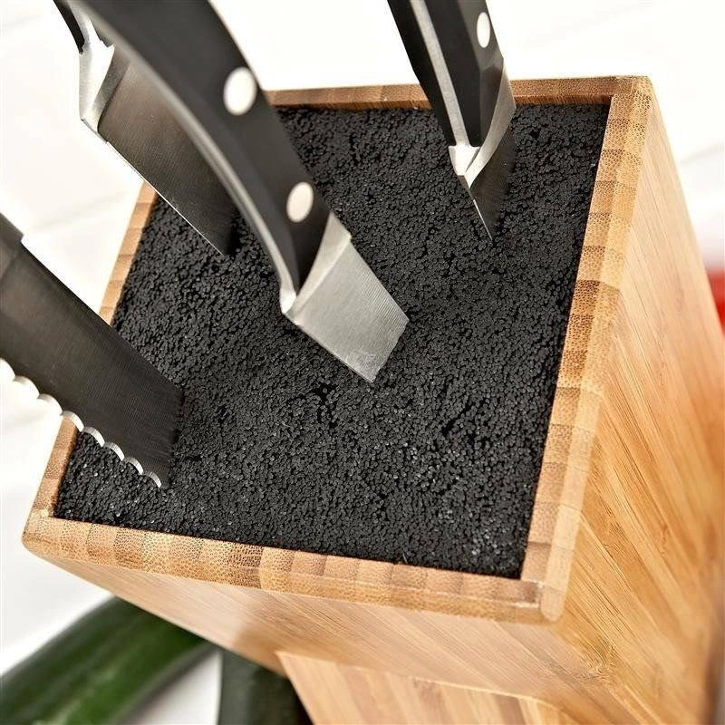 Stojalo je zasnovano za vsakodnevno udobje: nedrseče blazinice preprečujejo drsenje po pultu, odstranljiv vložek pa preprosto očistite – tudi v pomivalnem stroju. Tako shranjevanje nožev ostaja higiensko in dobro prezračeno, brez medsebojnega stika rezil.