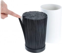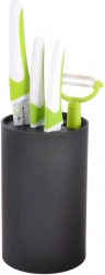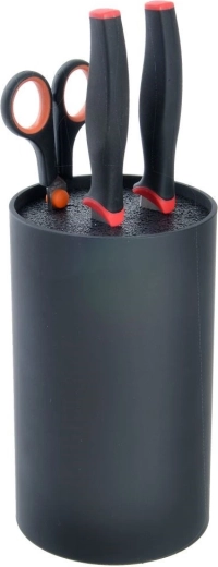 Kompaktna valjasta oblika v črni barvi prihrani prostor na pultu, drži orodja v navpičnem položaju in se odlično poda tako sodobni kot klasični kuhinji.