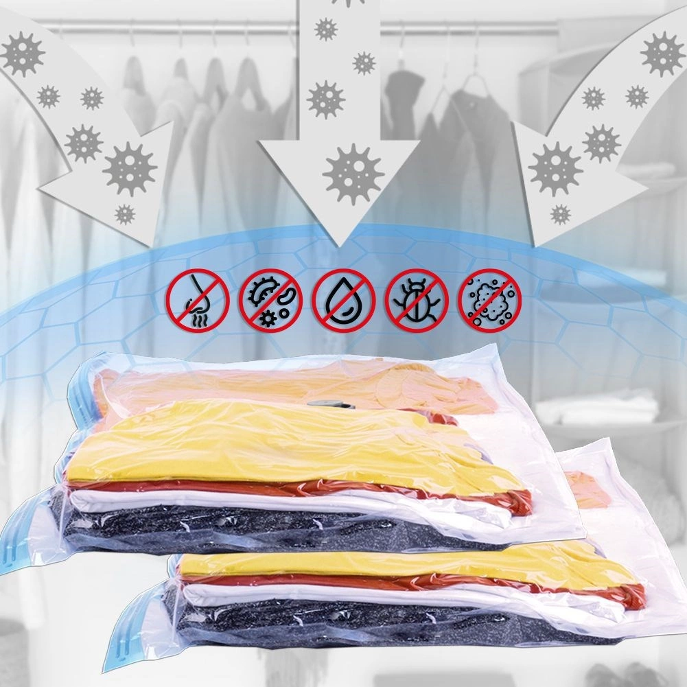 Zahvaljujoč enosmernemu ventilu in hermetični zadrgi zrak zanesljivo ostane zunaj vrečke, vaše tkanine pa so zaščitene pred prašnostjo, vlago, pršicami in molji. Uporaba je preprosta – napolnite, zaprite z zadrgo in skozi ventil izsesajte zrak s sesalnikom ali ročno črpalko.