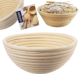 Okrogla ratanova košara za kruh s premerom 19 cm za hlebec približno 0,7 kg zagotovi pravilno vzhajanje, čvrsto obliko in dekorativen spiralni vzorec na skorji. Izdelana iz naravnega ratana, primerna za domače in profesionalno peko.