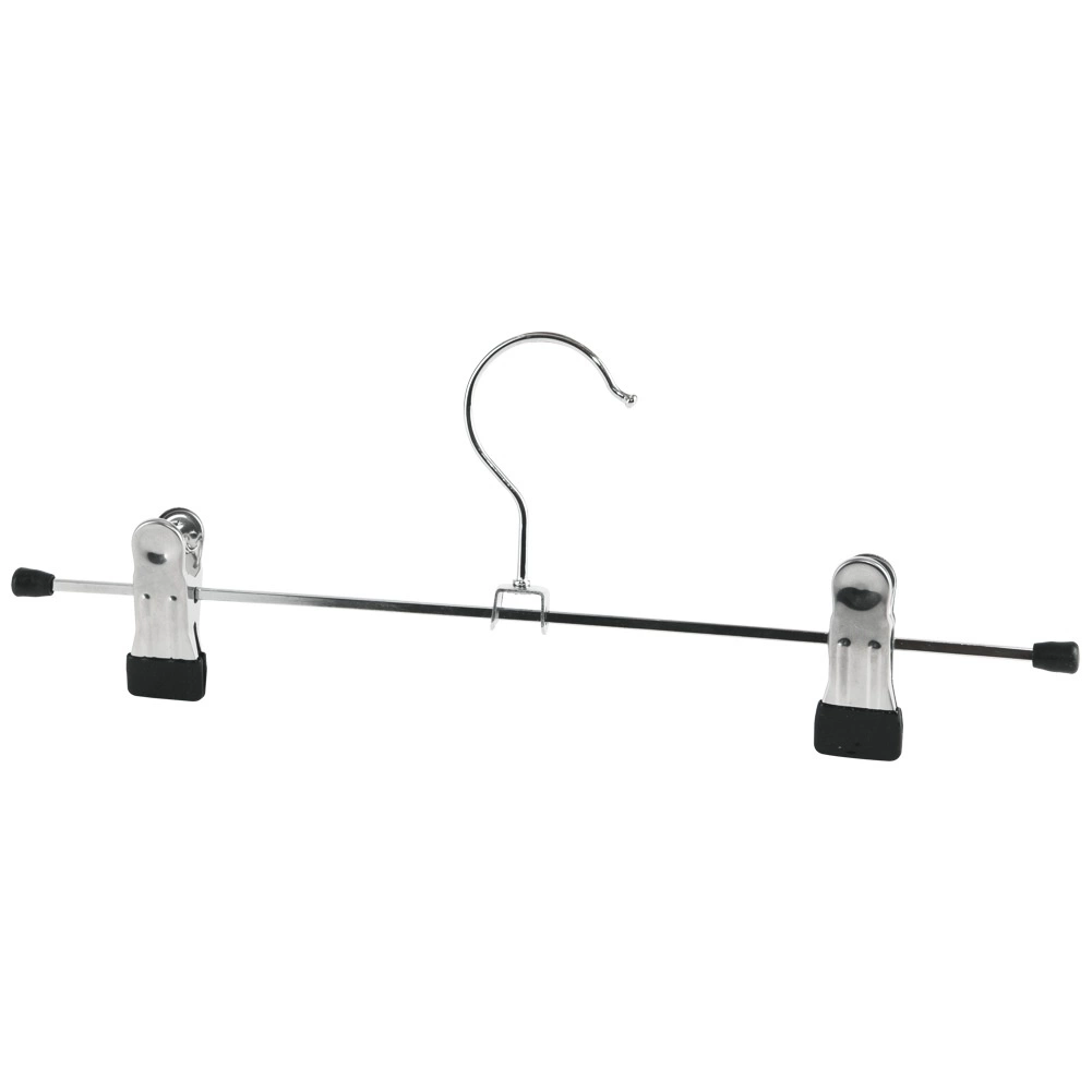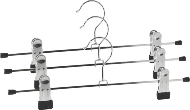 Komplet 3 kovinskih obešalnikov s klipsami je odličen pomočnik za organizacijo garderobe. Robustna kovinska izvedba v elegantni srebrni barvi ter klipse s črnimi končniki ščitijo tkanino pred poškodbami. Zahvaljujoč premičnim klipsam boste razmik zlahka prilagodili kateremu koli kosu – od ozkih kril do širokih hlač.