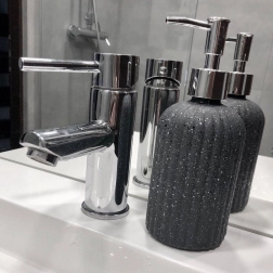 Stilski dozirnik za tekoče milo ali sredstvo za pomivanje posode izstopa s kakovostnim steklom v temno sivem odtenku z marmorirano strukturo. Kovinsko sijoča pumpica daje dodatku prestižen videz in zagotavlja udobno ter natančno doziranje. Dozirnik je primeren za moderne, klasične, loft in industrijske interierje.