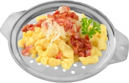 Poenostavite pripravo domačih njokov in halušk s tem trpežnim strgalom iz nerjavečega jekla. Zahvaljujoč premeru 27 cm, praktičnim ročajem in priloženi spatuli boste testo potisnili enakomerno in brez napora. Vsestranski pomočnik, ki v kuhinji nadomesti tudi cedilo za cejenje ali parno cedilo.