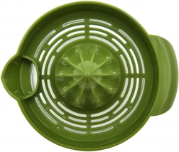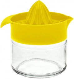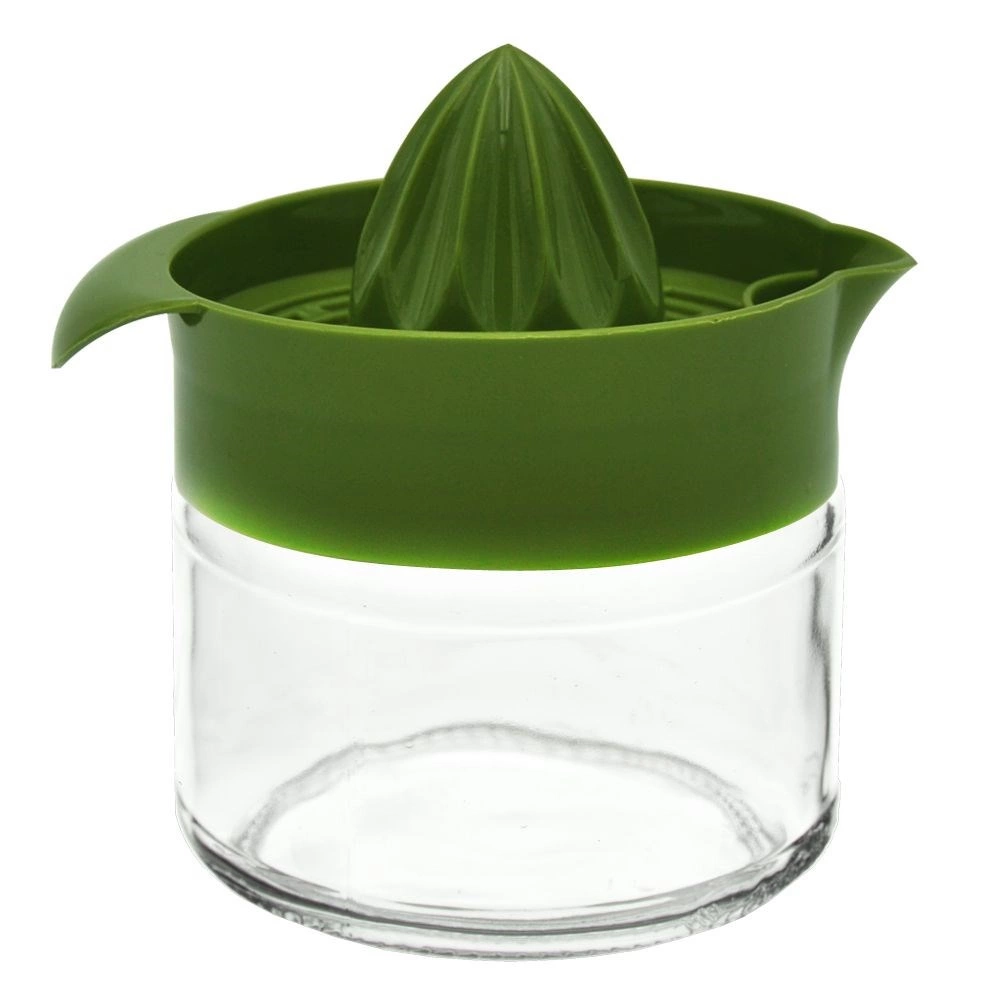 Klasčen steklen ožemalnik s plastičnim stožcem in vgrajenim sitom omogoča udobno iztiskanje soka neposredno v posodo. Kompaktne mere in stabilno dno zagotavljajo varno in hitro uporabo brez nereda.