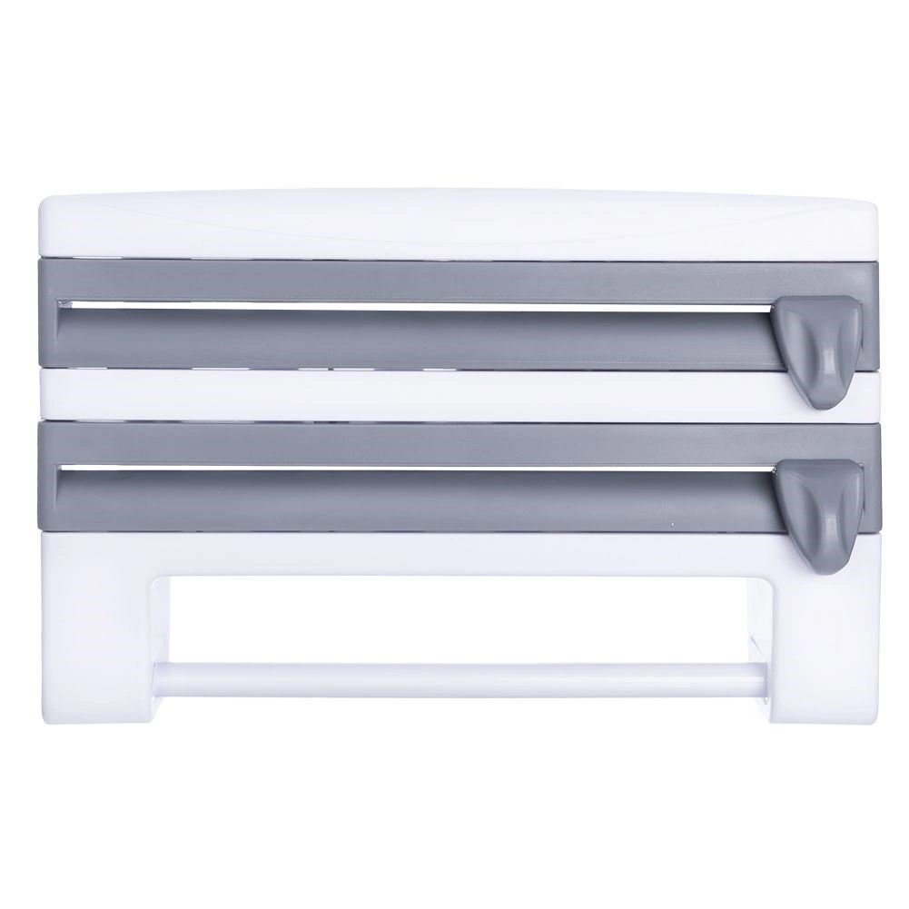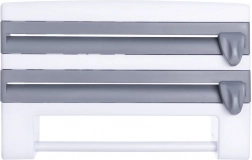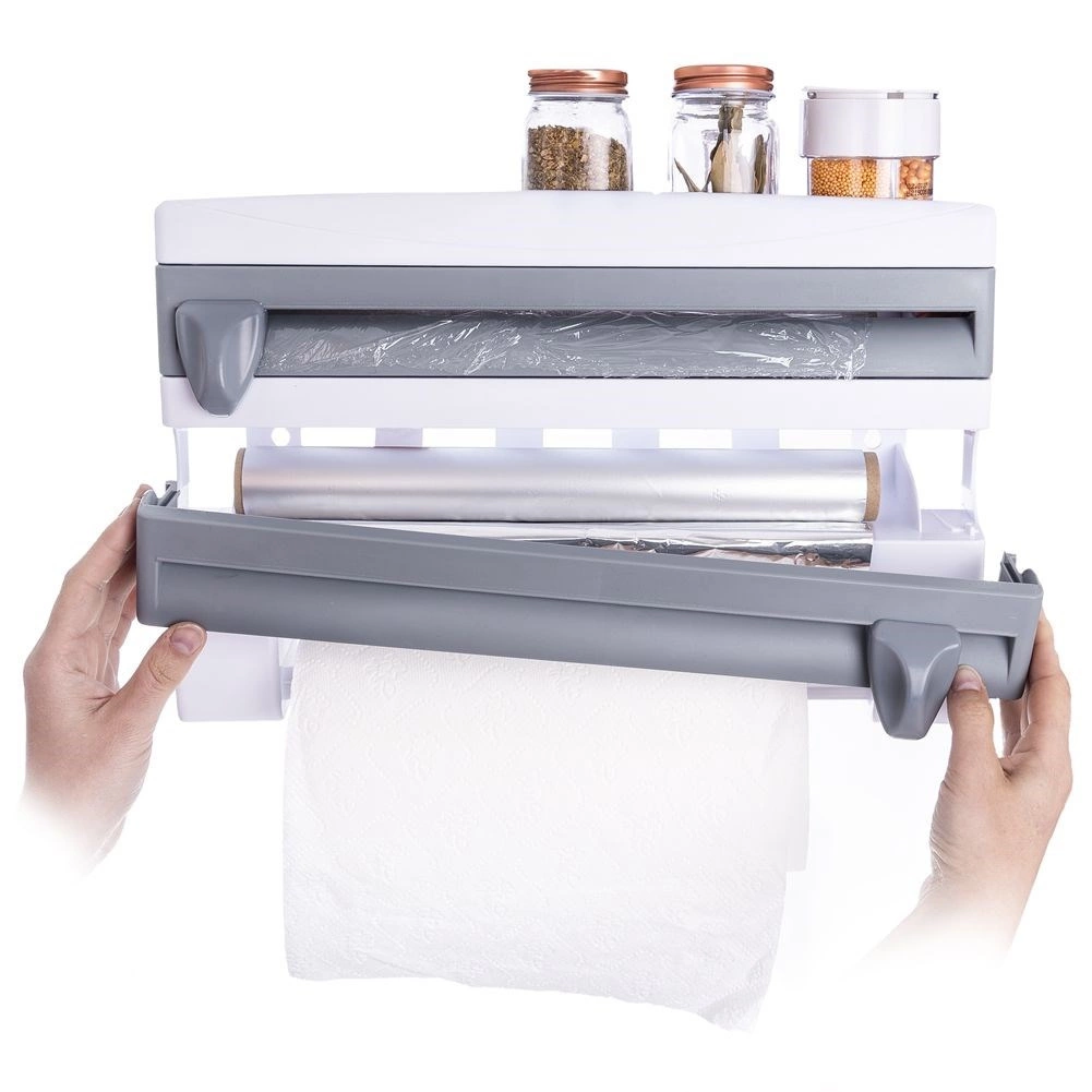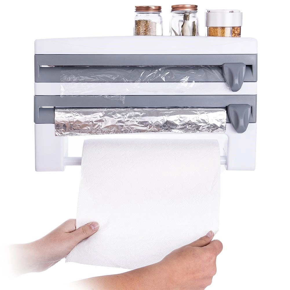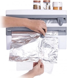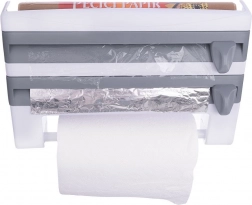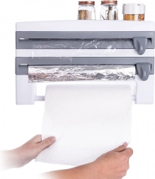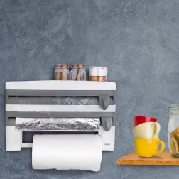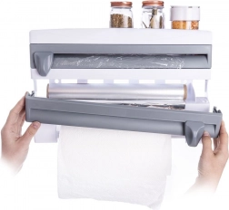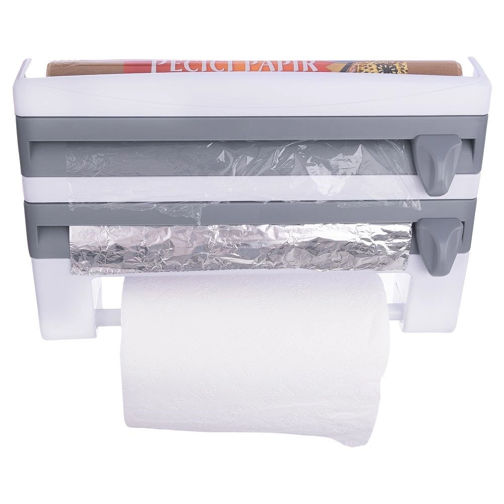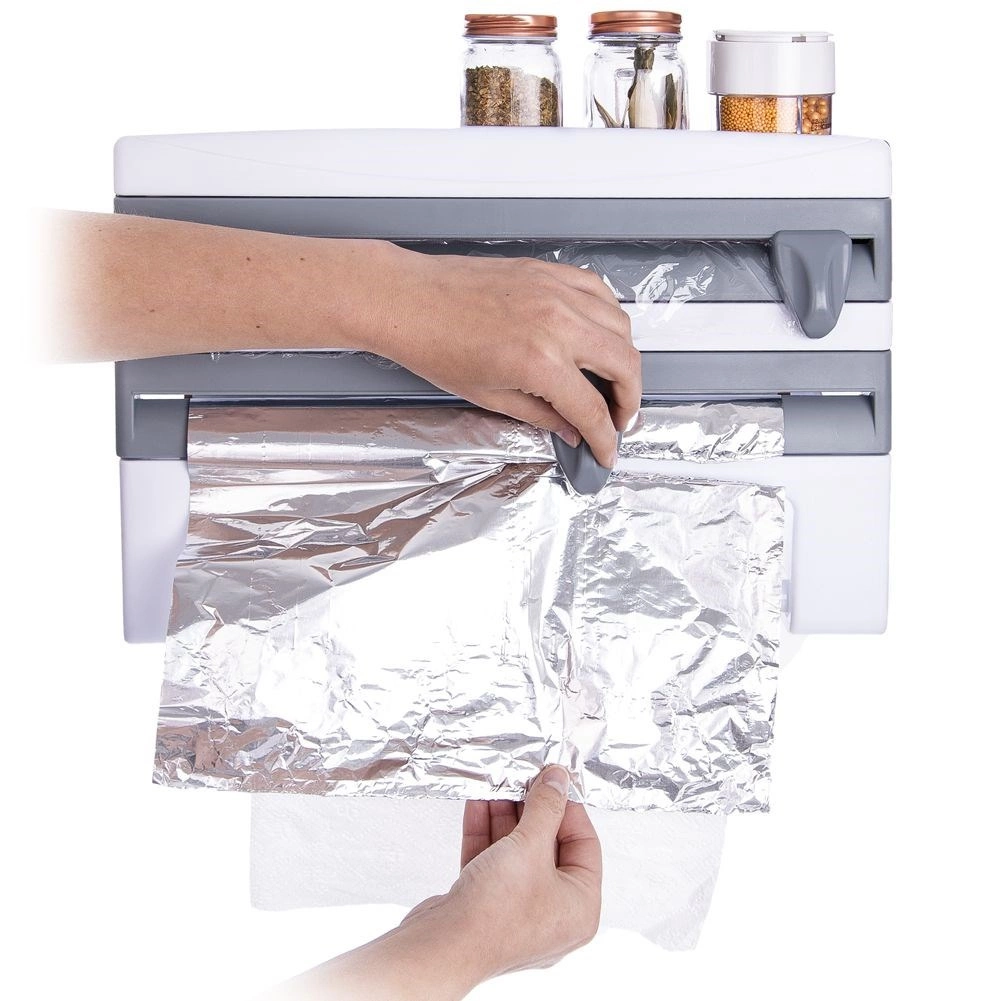 Stenski dozirnik za folije in papirnate brisače 3-v-1 je pametna rešitev za vsako kuhinjo in gostinski obrat. Dva ločena zalogovnika z vgrajenimi rezili omogočata gladko odvijanje in varno, natančno rezanje živilske in aluminijaste folije. Spodnja palica drži standardni roli papirnatih brisač vedno pri roki, medtem ko zgornja polica zagotavlja prostor za začimbe, peki papir ali manjše kuhinjske pripomočke.