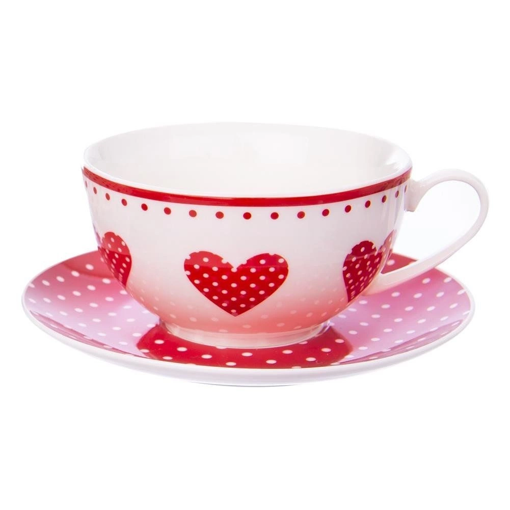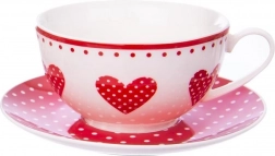 Belo osnovo dopolnjujejo rdeče pikice in srčki – set polepša kuhinjo in mizo ter razveseli kot darilo.