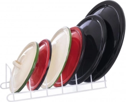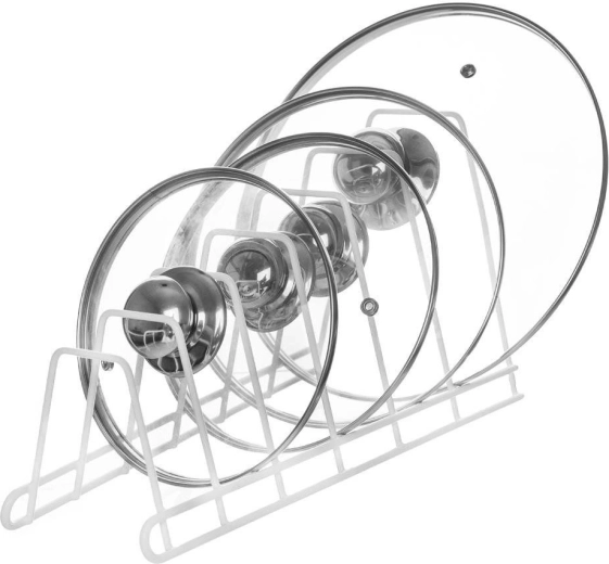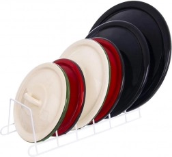 Stojalo je primerno za različne velikosti in vrste – od pokrovov z gumbom do plitvih krožnikov in rezalnih desk, za v omarico ali na kuhinjski pult.