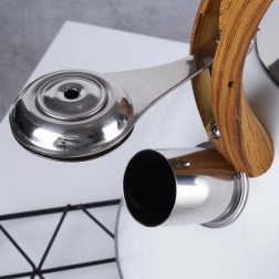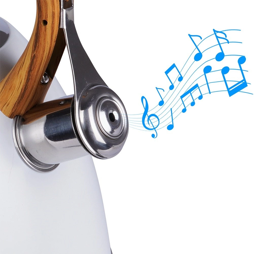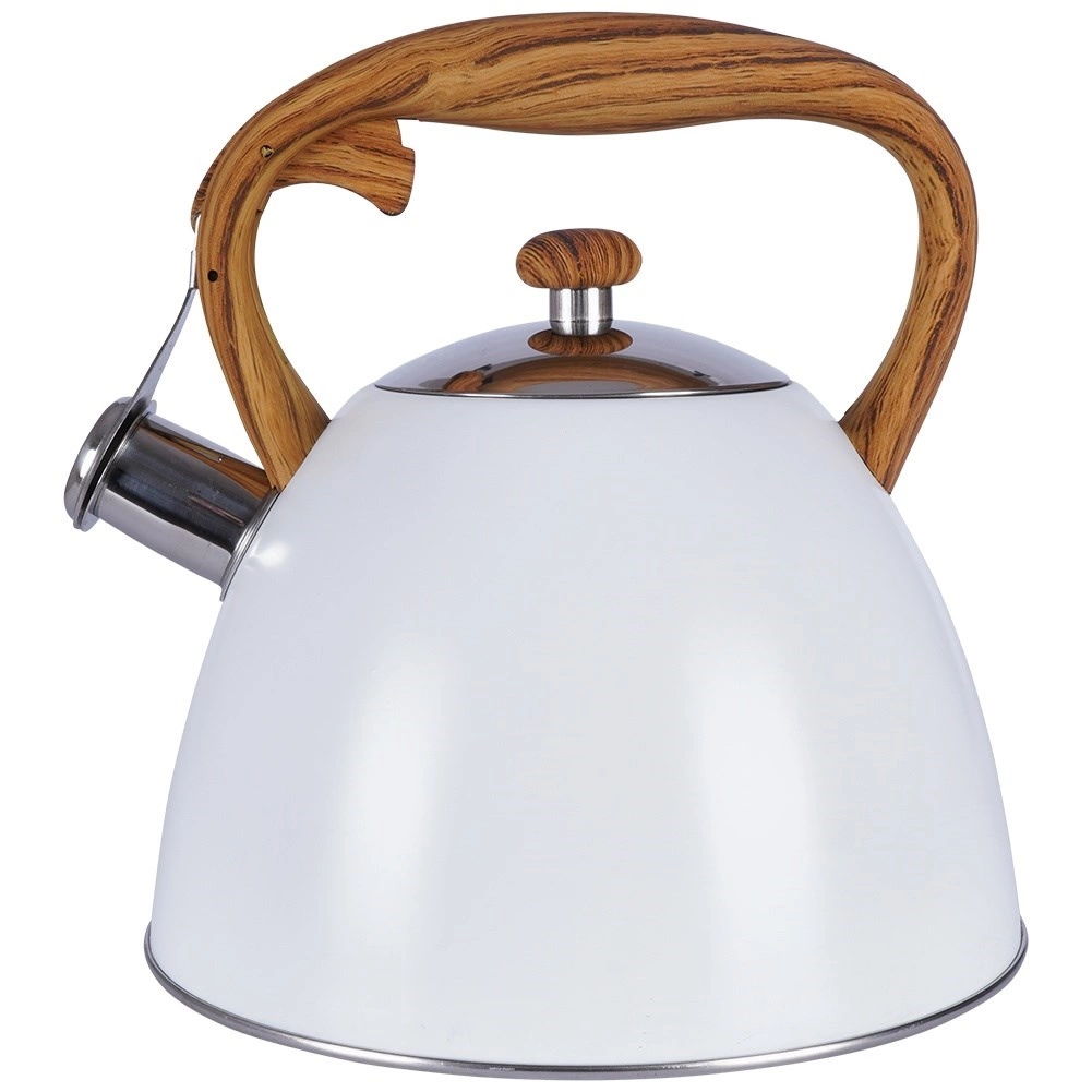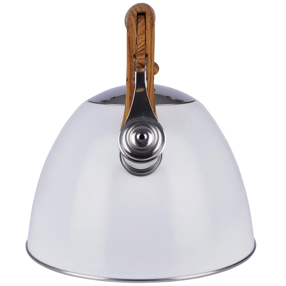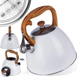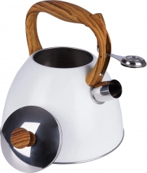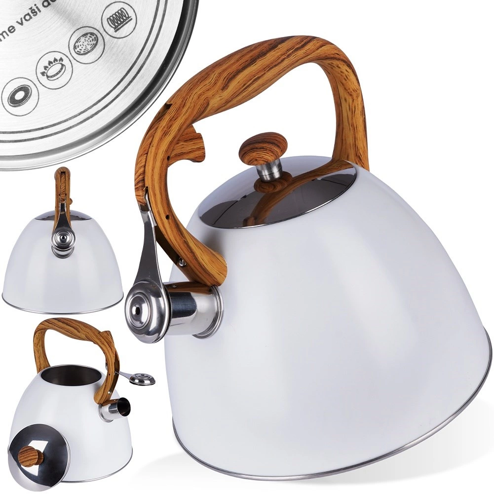 Ta klasičen, oblikovno čist čajnik združuje odporno nerjavno jeklo z modernim belim premazom in udobnim ročajem v videzu lesa. Žvižgalka s samodejnim odpiranjem v ročaju olajša nalivanje, širok pokrov pa udobno dolivanje vode in čiščenje. Zaradi kakovostnega materiala ne vpliva na okus vode in zagotavlja učinkovit prenos toplote.