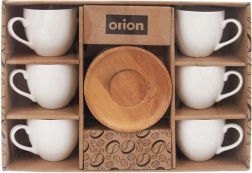 Šest belih porcelanastih skodelic z lesenimi krožnički tvori harmonično celoto in polepša vsako mizo. Idealno za domače bariste in tudi kot darilo.