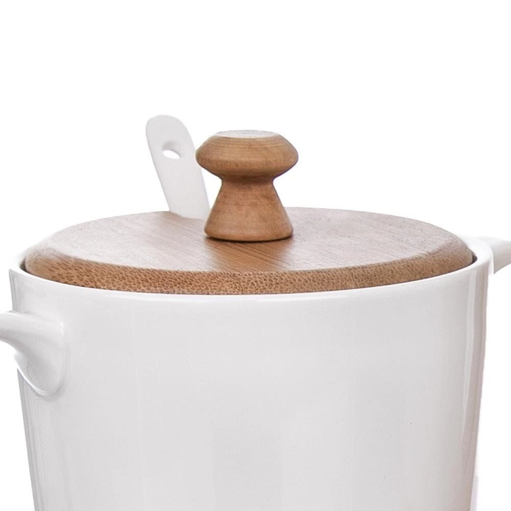 porcelan (posodica za sladkor, vrček za mleko, žlička), bambusov les (stojalo, pokrov)