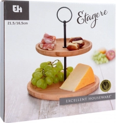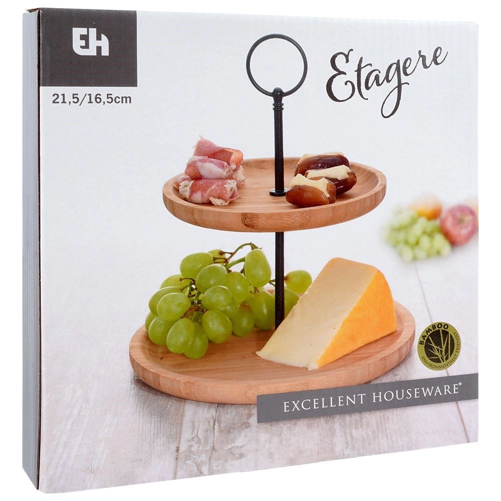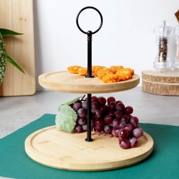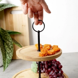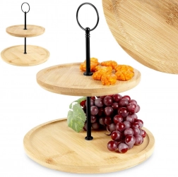 Privoščite svoji mizi eleganten dodatek: dvonadstropno stojalo iz naravnega bambusa z robustno kovinsko konstrukcijo v črni barvi. Idealen je za cupcake, piškote, mini sladice, sadje in slane kanapeje. Dve ravni prihranita prostor in hkrati omogočita privlačno predstavitev.