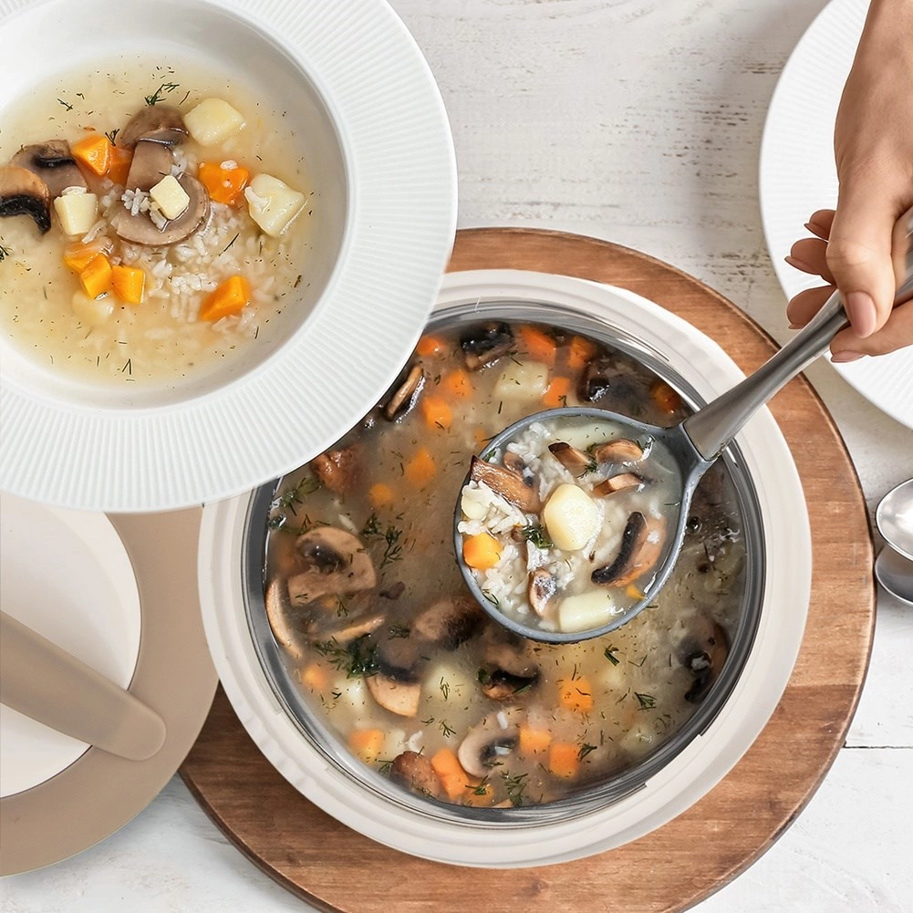 Zahvaljujoč izolacijski zasnovi z nerjavečo notranjostjo juhe in glavne jedi ostanejo tople, sladice in sladoled pa prijetno hladni.