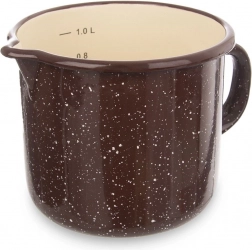 Stilski rjav emajliran lonček z bež pikicami v retro dizajnu olajša vsakodnevno kuhanje in peko. Zahvaljujoč praktičnemu izlivniku se udobno prelivata tekočina in notranje merilo omogoča natančno odmerjanje tekočih in suhih sestavin brez dodatnih pripomočkov. Čvrst ročaj zagotavlja varno in udobno rokovanje.