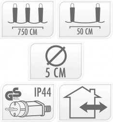 Namestitev je hitra in udobna – vsako grlo je opremljeno s priročno kljukico za obešanje. Girlanda ima zaščito IP44, zato je odporna proti škropljenju vode in primerna za zunanjo uporabo. Zahvaljujoč varčnim LED se lahko veselite lepe svetlobe ob nizki porabi energije.