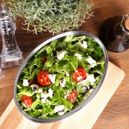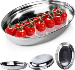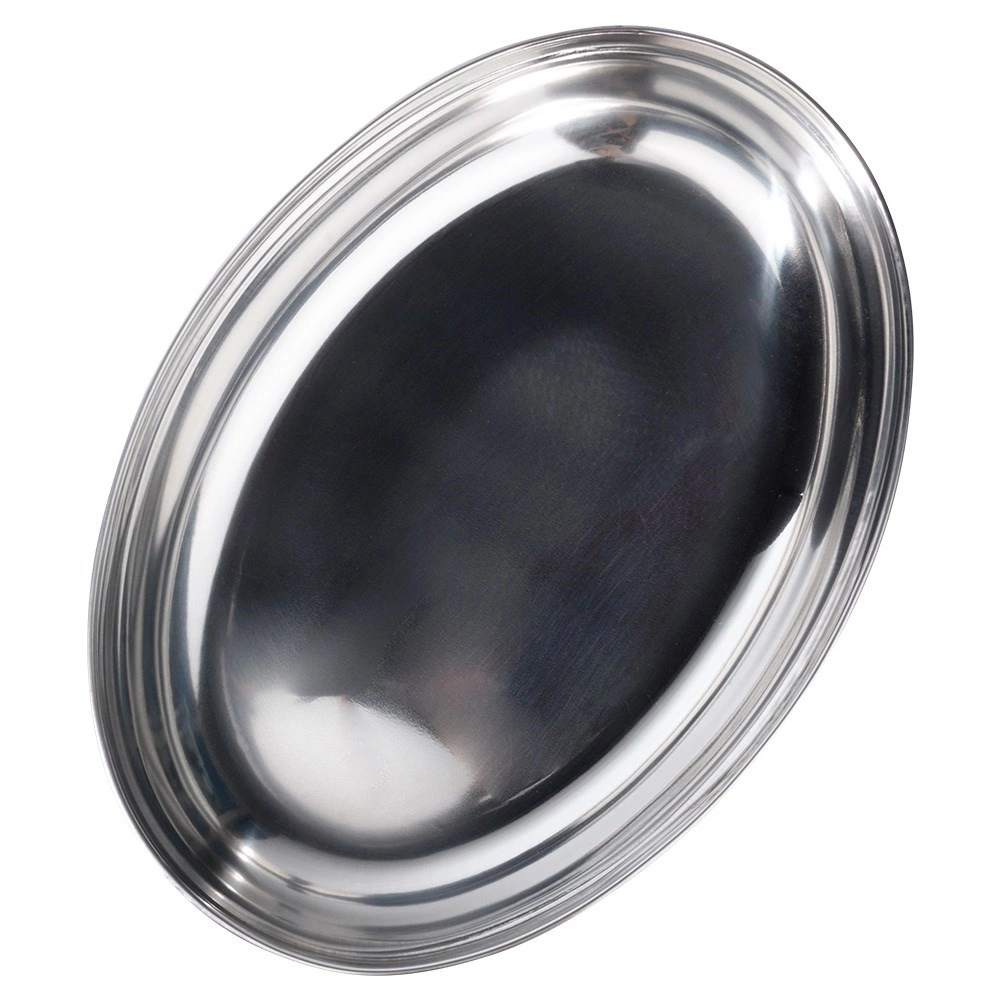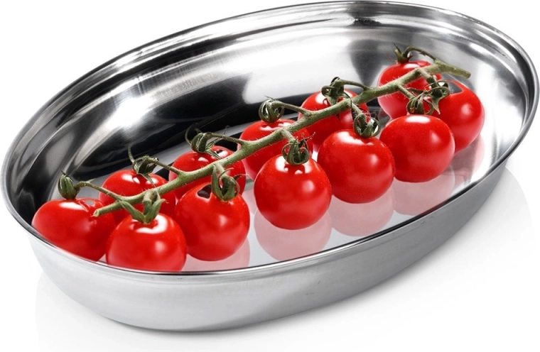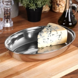 Praktičen in stilen ovalen servirni pladenj z globokim profilom je izdelan iz nerjavnega jekla v elegantni srebrni izvedbi. Prenese udarce in običajno ravnanje, zato je odlična alternativa steklenim skledam in krožnikom. Gladka površina se zlahka vzdržuje čista in je varna za stik z živili.