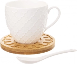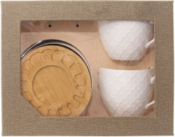 Popestrite svoj kavni kotiček s stilskim setom, ki združuje čist bel porcelan in naravni bambus. Skodelici z elegantnim reliefom lepo dopolnita vsako namizno opremo, udobno uho pa omogoča odlično rokovanje. Set je praktičen za vsakodnevno uporabo in hkrati reprezentativen za slavnostne trenutke.