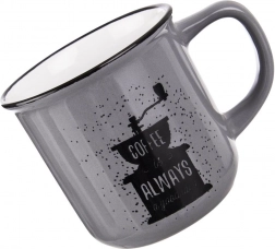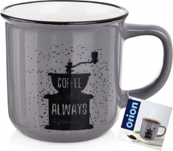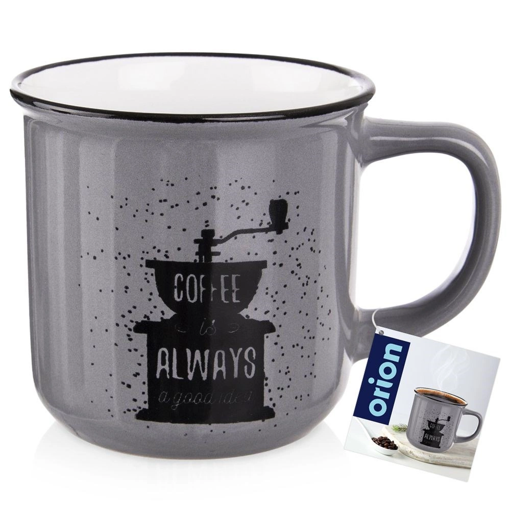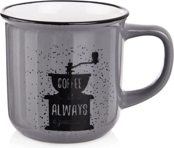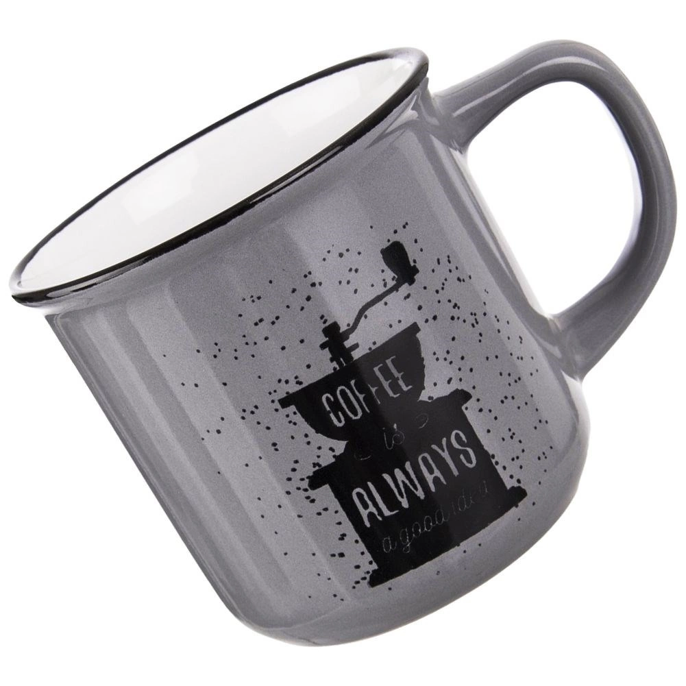 Ta vsestranska skodelica iz kakovostne keramike je odlična za kavo, čaj, kakav in druge tople napitke. Diskretna siva izvedba s stilskim potiskom kavnega mlinčka se poda tako v moderno kot rustikalno kuhinjo. Preprosta, klasična oblika zagotavlja udobno uporabo vsak dan.