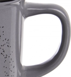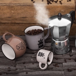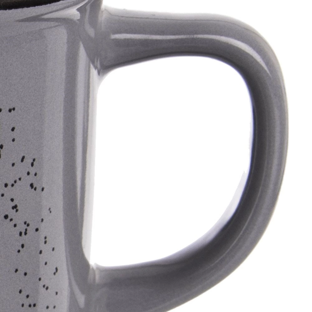 Elegantno sivo površino dopolnjuje črn potisk ročnega mlinčka in napis – skodelica bo razveselila vsakega ljubitelja kave ter polepšala kuhinjo ali pisarno.