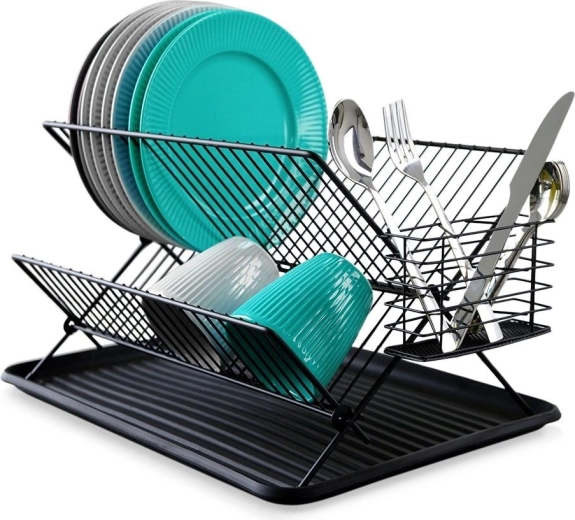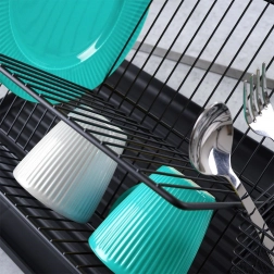 Zgornja raven z namenskimi režami sprejme do 21 krožnikov, spodnja raven je idealna za skodelice, sklede in kozarce. Vse se suši hitro in organizirano.