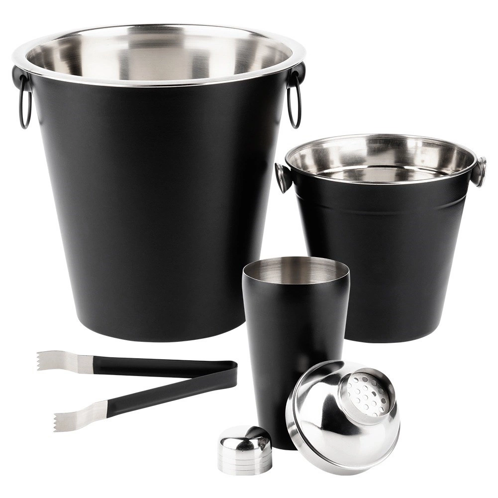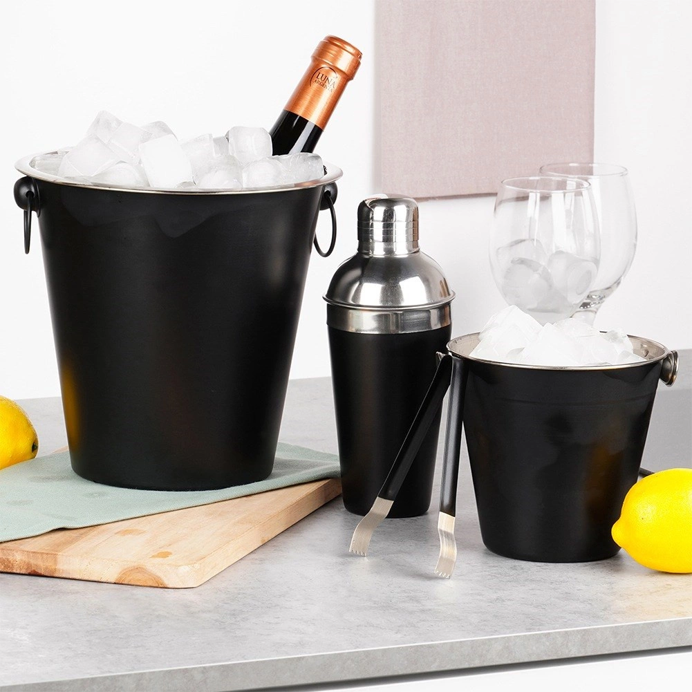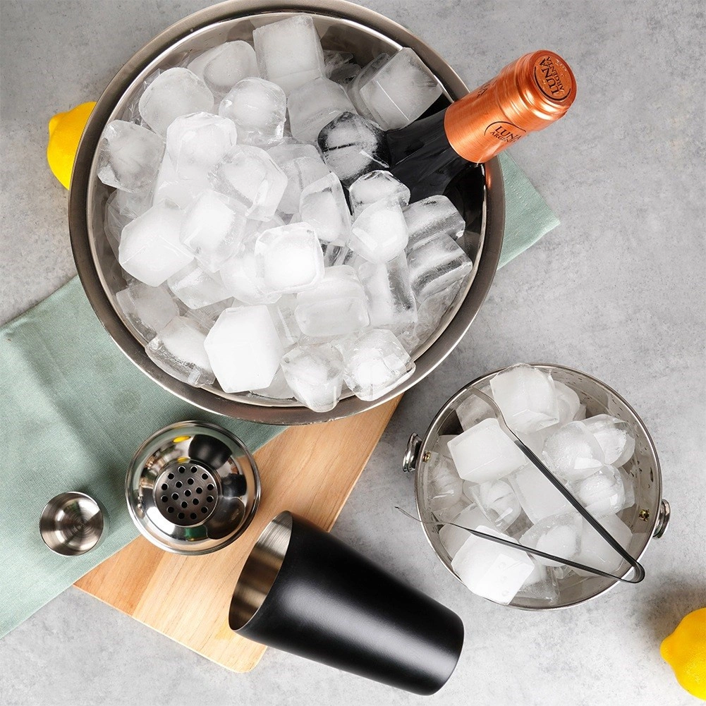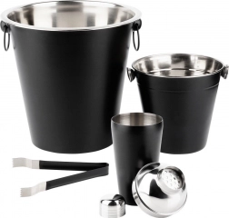 Shaker, malo vedro za led, veliko vedro za steklenico in klešče – vse, kar potrebujete za pripravo in strežbo koktejlov.