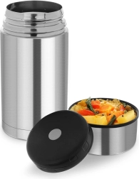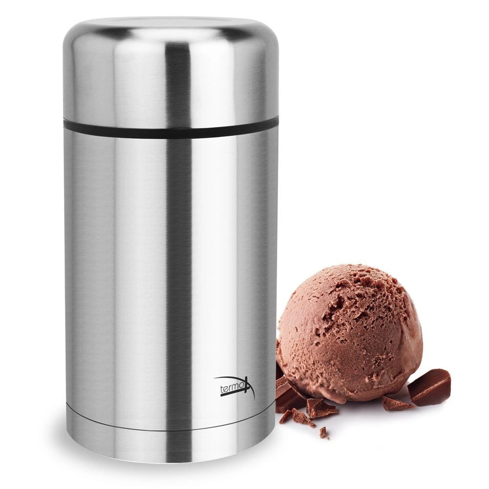 Praktičen in vzdržljiv termos za hrano iz nerjavnega jekla z vakuumsko dvojno steno ohranja vašo hrano dolgo toplo ali hladno. Zahvaljujoč širokemu odprtju se zlahka polni in čisti, tesnilni pokrov preprečuje iztekanje, nerjavna posodica v pokrovu pa služi za serviranje. Idealno za juhe, pripravljene jedi in hladne sladice doma, v službi in na poti.