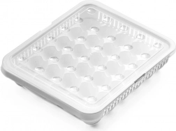 Transparenten pokrov omogoča hiter pregled vsebine in hkrati ščiti jajca. Ravna zgornja površina je primerna za varno zlaganje v stolp.