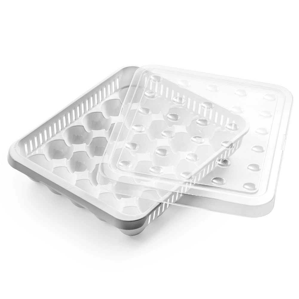 Ohranite jajca pregledno in varno shranjena. Ta prostorna škatla sprejme do 30 jajc, ima prozoren pokrov za hitro kontrolo zalog in oblikovane vdolbine, ki držijo vsako jajce na mestu. Zaradi kompaktnih mer 33 × 27 × 7 cm se zlahka prilega večini polic v hladilniku in jo je mogoče priročno zlagati.