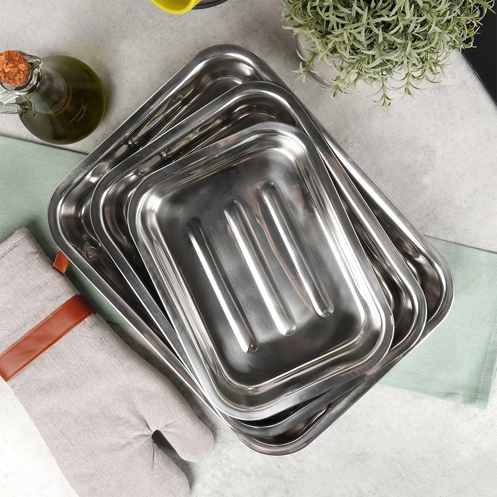 Vsak pekač ima visoke, čvrste robove za varno pečenje brez prelivanja. Pekače lahko uporabite tudi za serviranje neposredno na mizo – jedi ostanejo dlje tople in izgledajo elegantno. Material je odporen proti koroziji in primeren za vse tipe pečic do 230 °C.