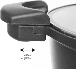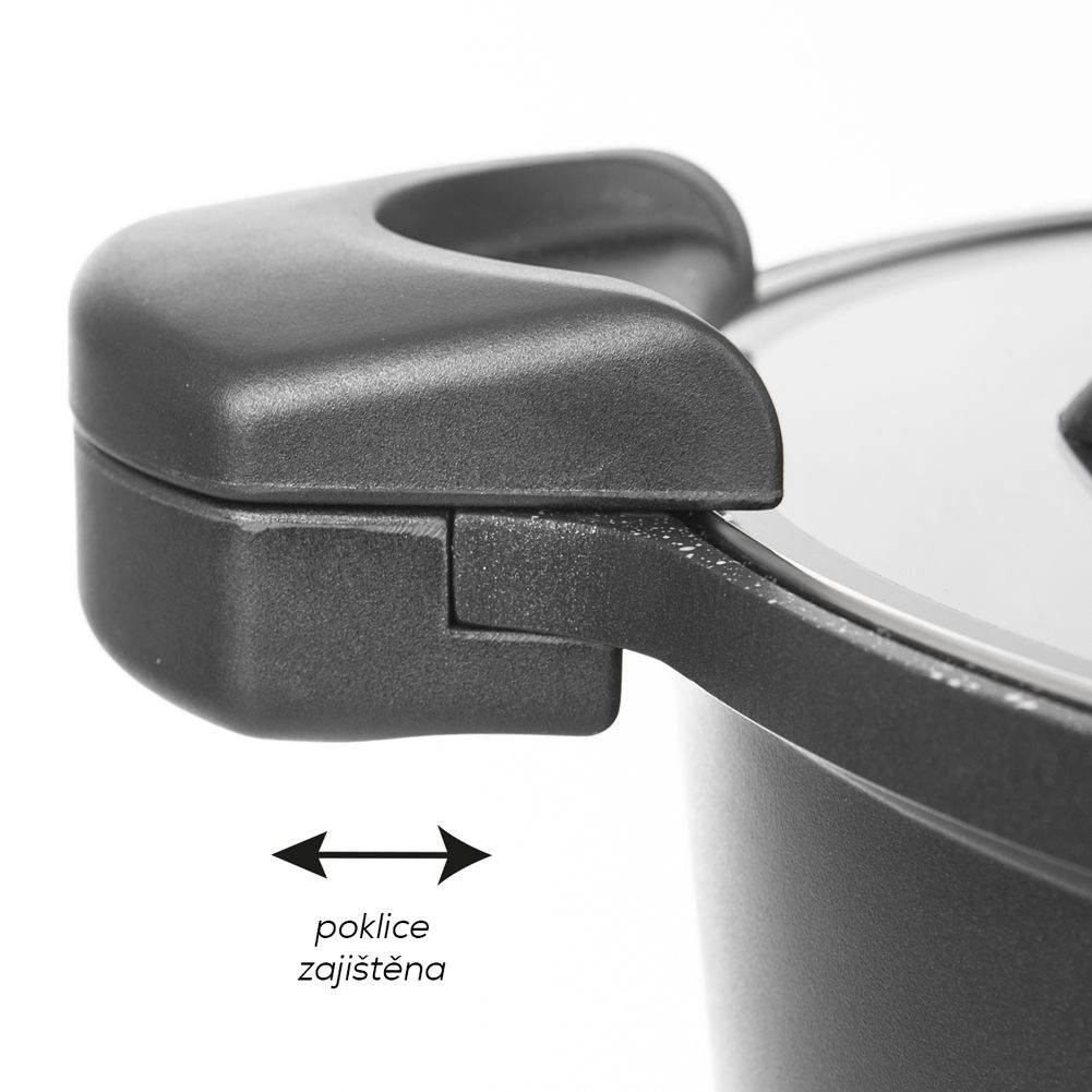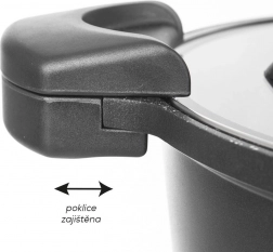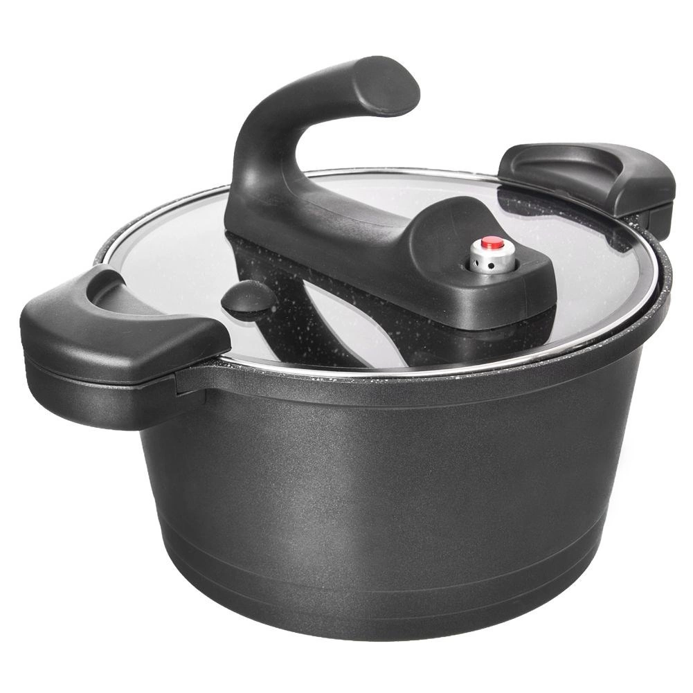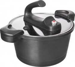 Dva varnostna ventila, silikonsko tesnilo in drsni ročaji zanesljivo pritrdijo pokrov in nadzorujejo tlak med kuhanjem.