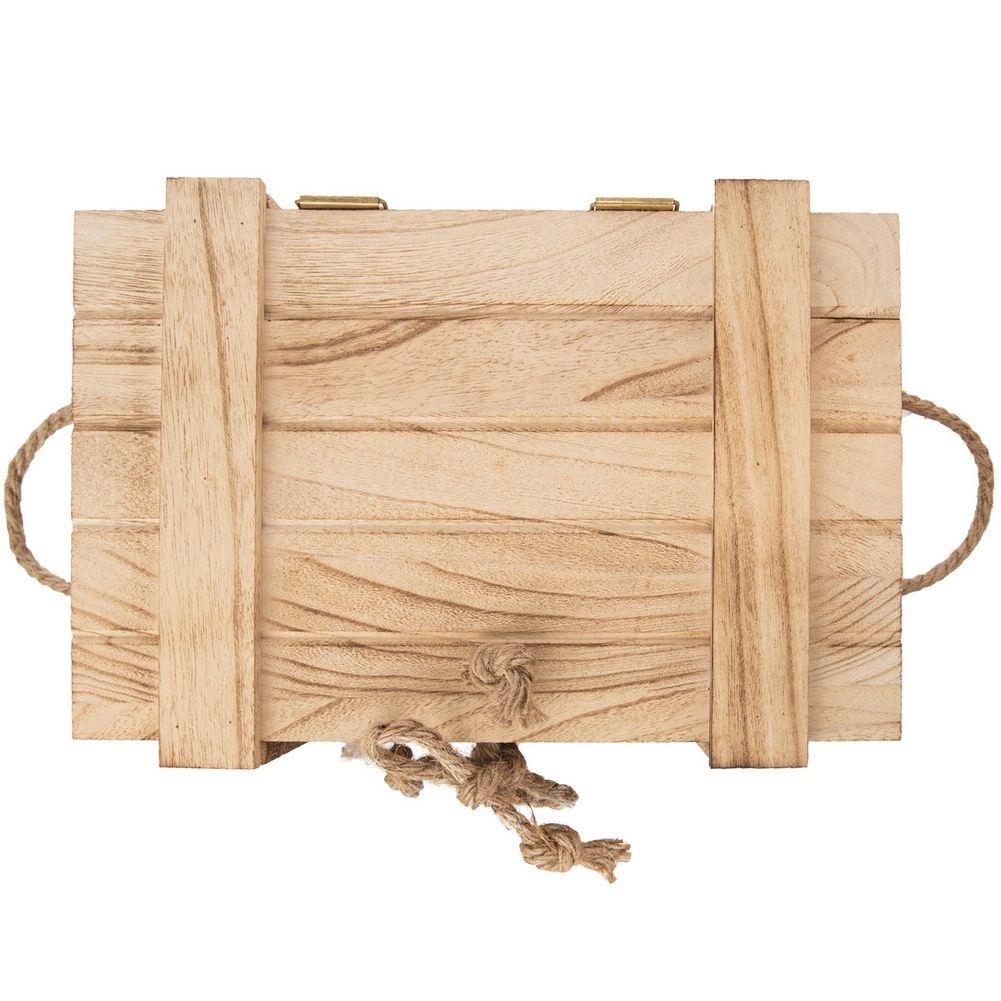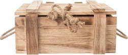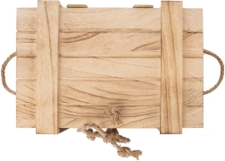 Ta lesena shranjevalna škatla z rustikalnim videzom v vsak prostor prinese red in slog. Zaradi naravnega lesa je lahka, trpežna in odlična za organizacijo drobnarij, dokumentov, dekoracij in spominov. Praktični vrvni ročaji olajšajo prenašanje.