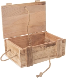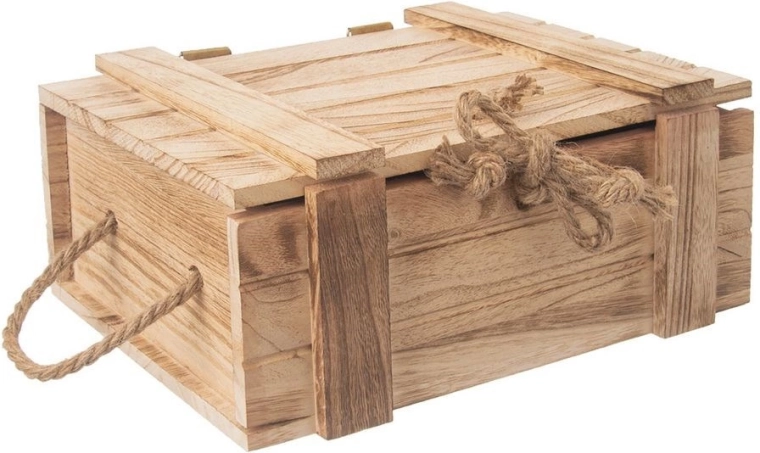Pokrov je opremljen s tečaji in zavezovanjem iz jutove vrvice, zato ostane varno zaprt in pri odpiranju ne pade. Škatla je odlična tudi kot darilna embalaža – po predaji darila služi kot uporaben shranjevalni zabojček.