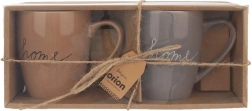 Komplet dveh univerzalnih porcelanastih skodelic v sivi in rjavi barvi bo odlično dopolnil vaš dom. Zaradi klasične oblike in udobnih ročajev se skodelice prijetno držijo in enostavno uporabljajo. Stilski dekor z napisom Home doda postrežbi napitkov prijetno, domačno vzdušje. Izdelki so preprosti za vzdrževanje in primerni za vsakodnevno uporabo.