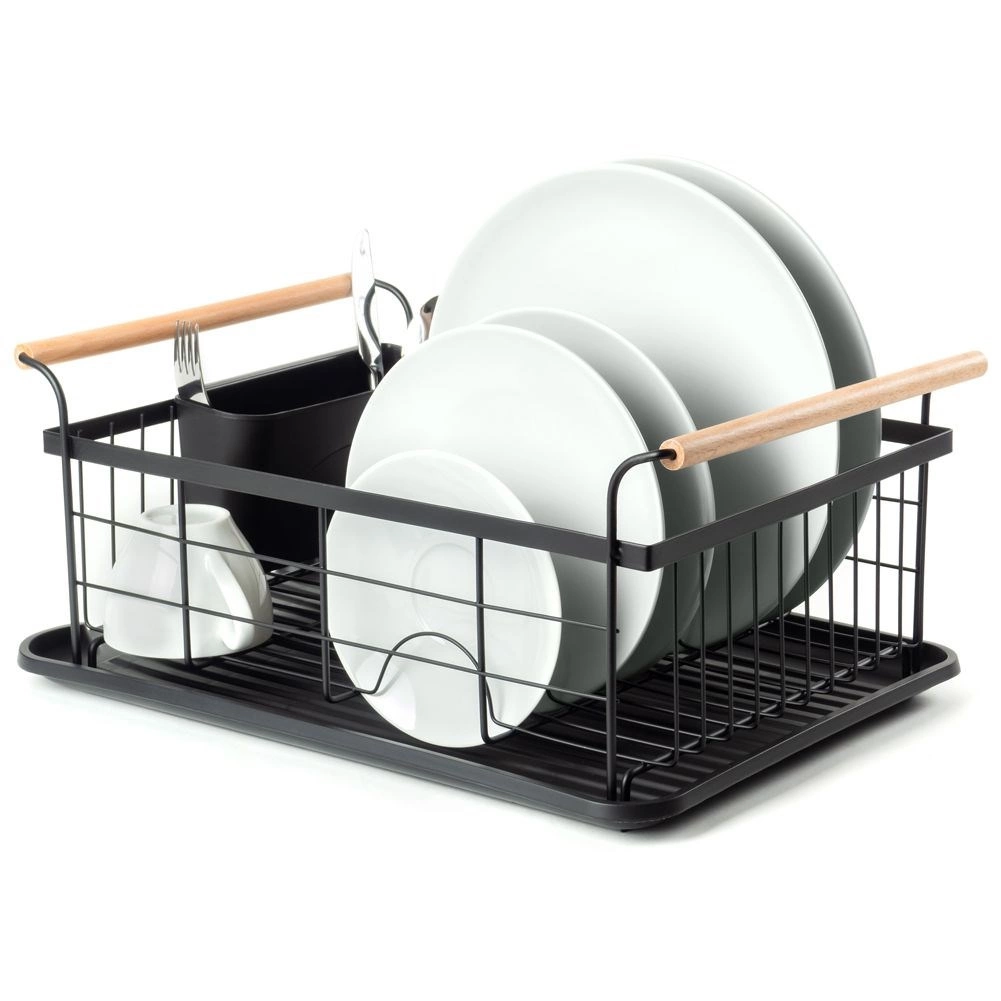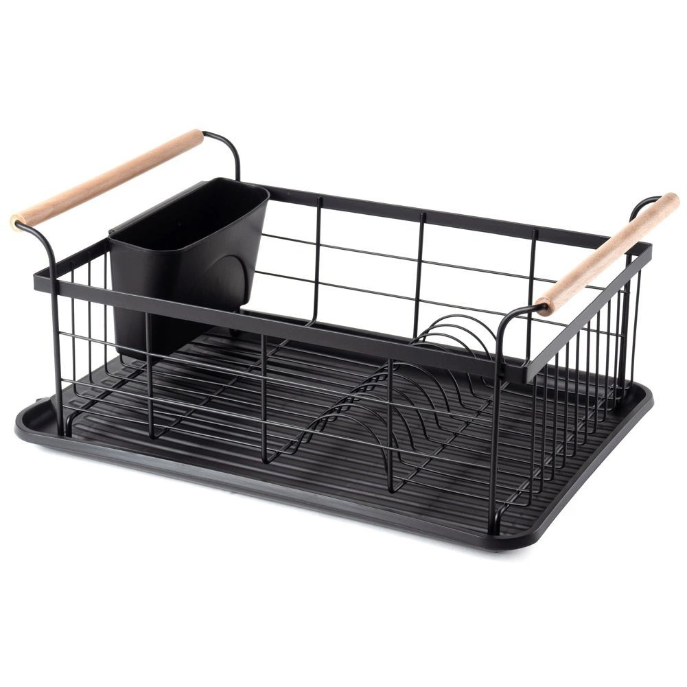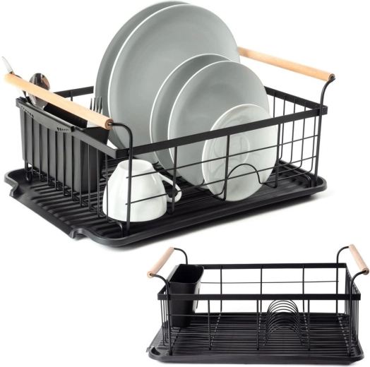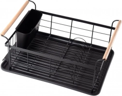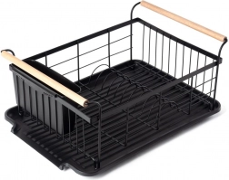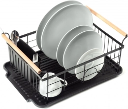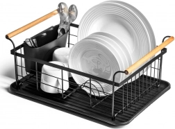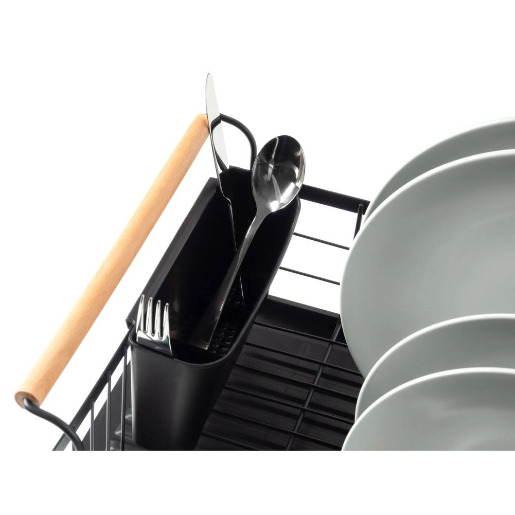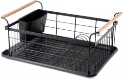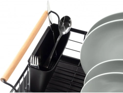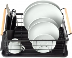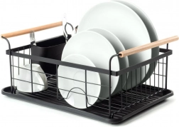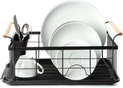 Eleganten in funkcionalen sušilnik iz črno lakirane kovine združuje visoko vzdržljivost s praktičnimi detajli za udobno sušenje krožnikov, kozarcev in pribora. Žlebljen odcejalni pladenj zadrži vodo in ščiti delovno površino, medtem ko izvlečni košek za pribor poskrbi za red in hitro sušenje.