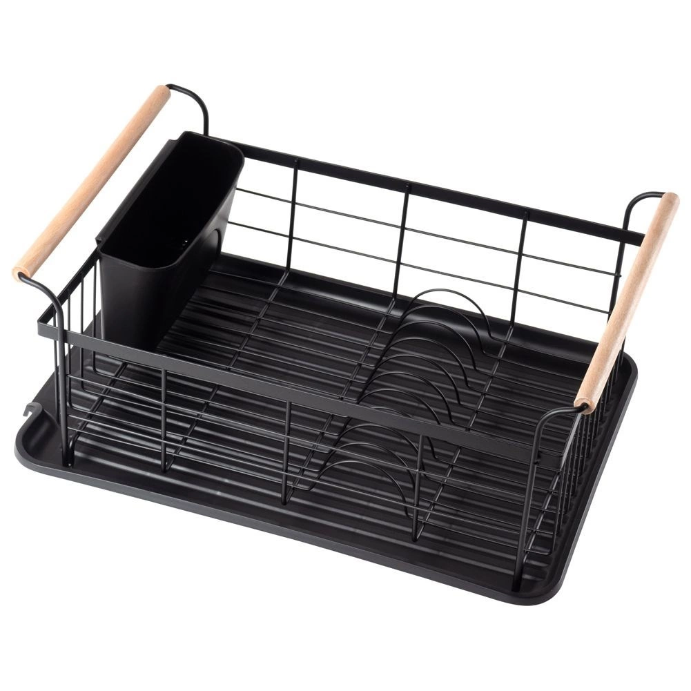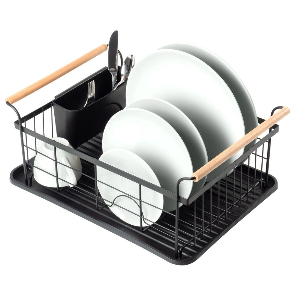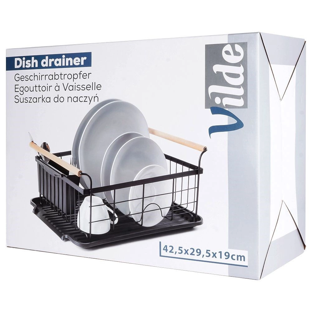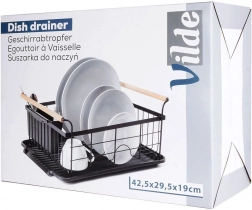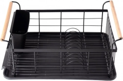 Eleganten in funkcionalen sušilnik iz črno lakirane kovine združuje visoko vzdržljivost s praktičnimi detajli za udobno sušenje krožnikov, kozarcev in pribora. Žlebljen odcejalni pladenj zadrži vodo in ščiti delovno površino, medtem ko izvlečni košek za pribor poskrbi za red in hitro sušenje.