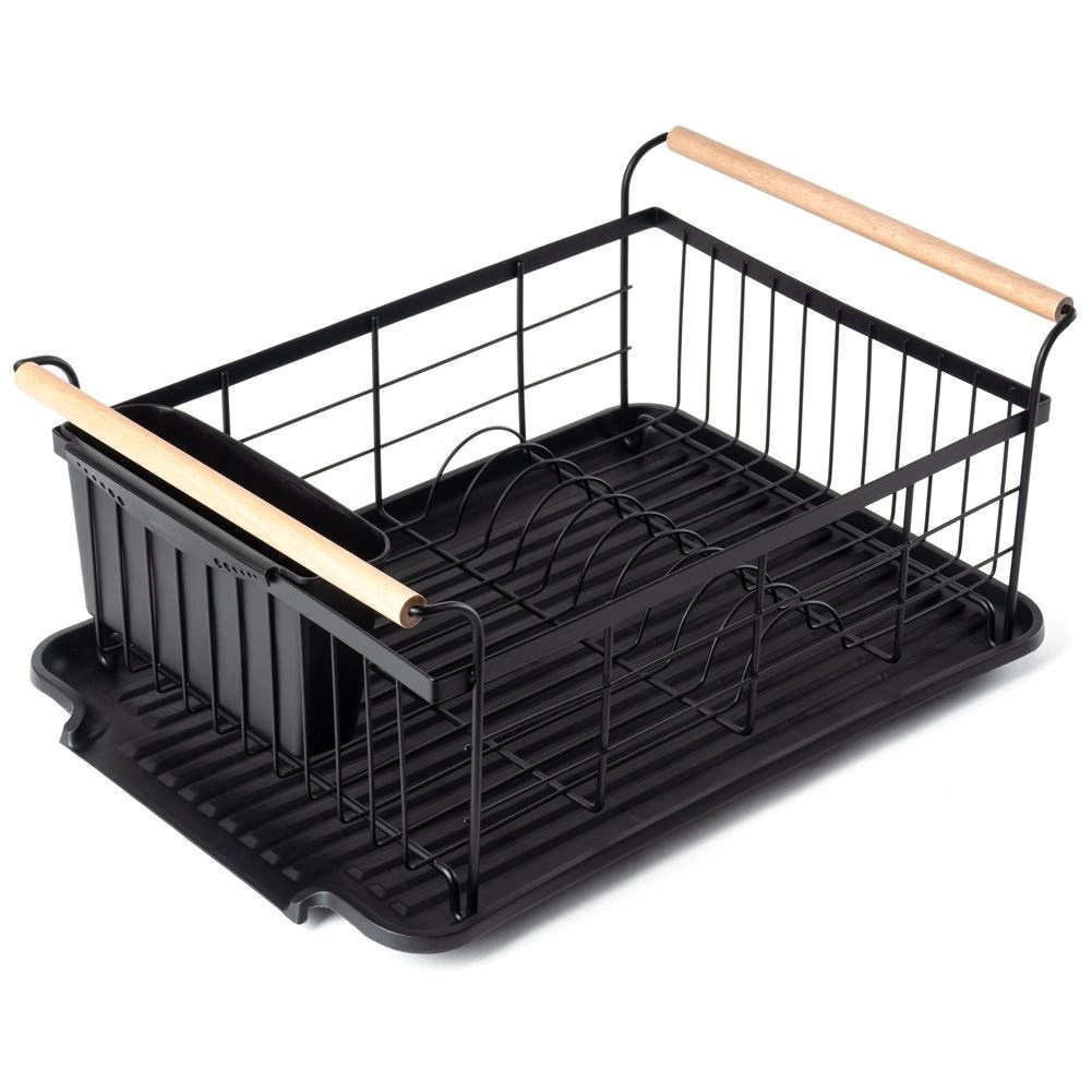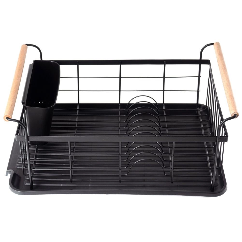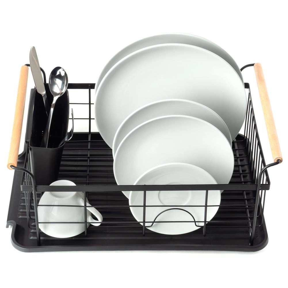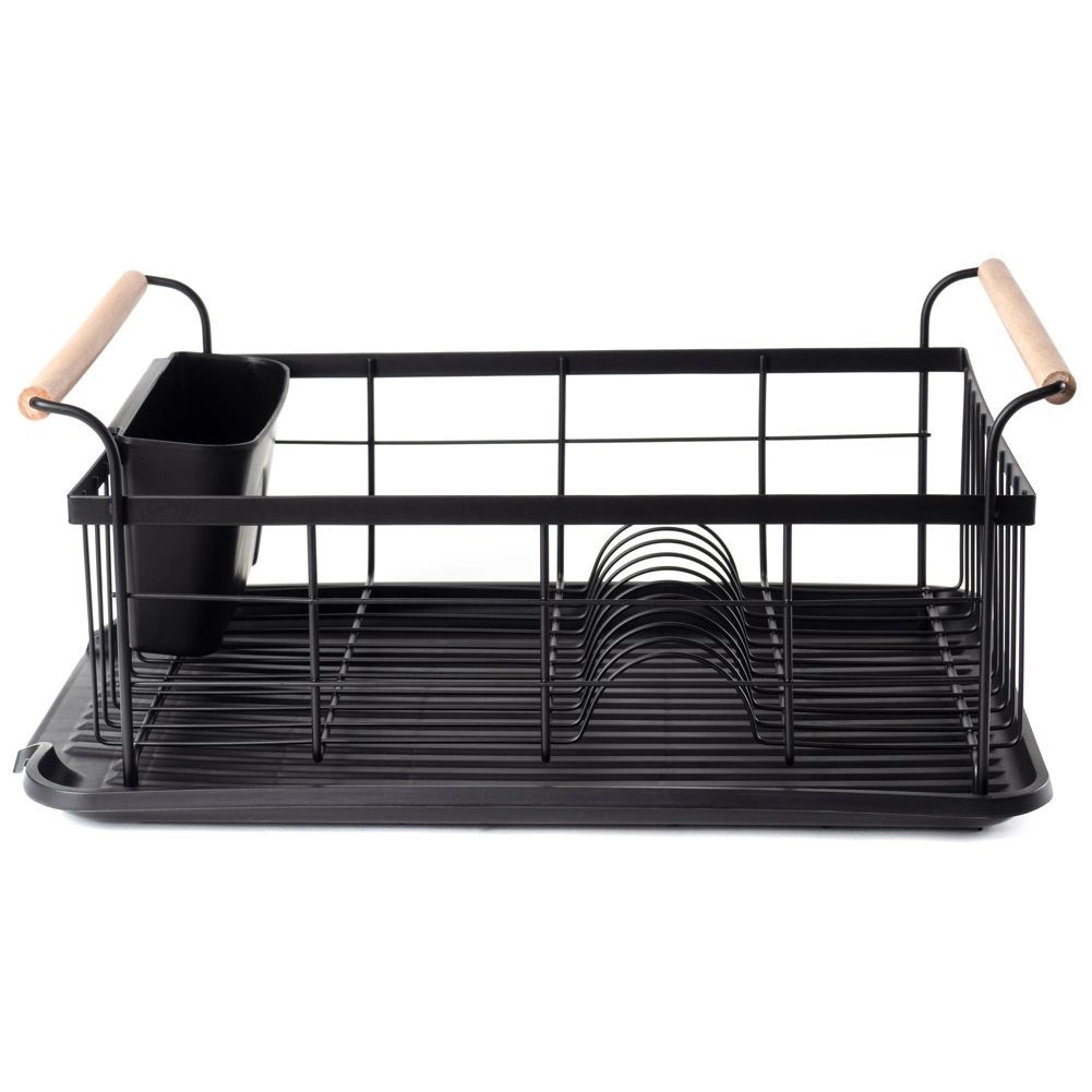 Odporna črna kovina s preciznimi zvari varno drži krožnike in kozarce na mestu, medtem ko rebrast pladenj učinkovito odvaja vodo.