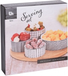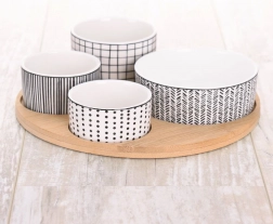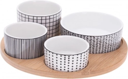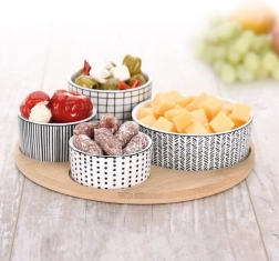 Stilski 5-delni set za vsakdanjo in praznično pogostitev. Štiri porcelanaste skledice v različnih velikostih ponujajo popolno rešitev za serviranje oreškov, antipasti, oljk, dipov ali omak. Okrogel bambusov pladenj z označenimi mesti za vsako skledico zagotavlja varno in udobno prenašanje brez drsenja.