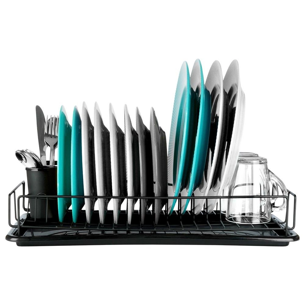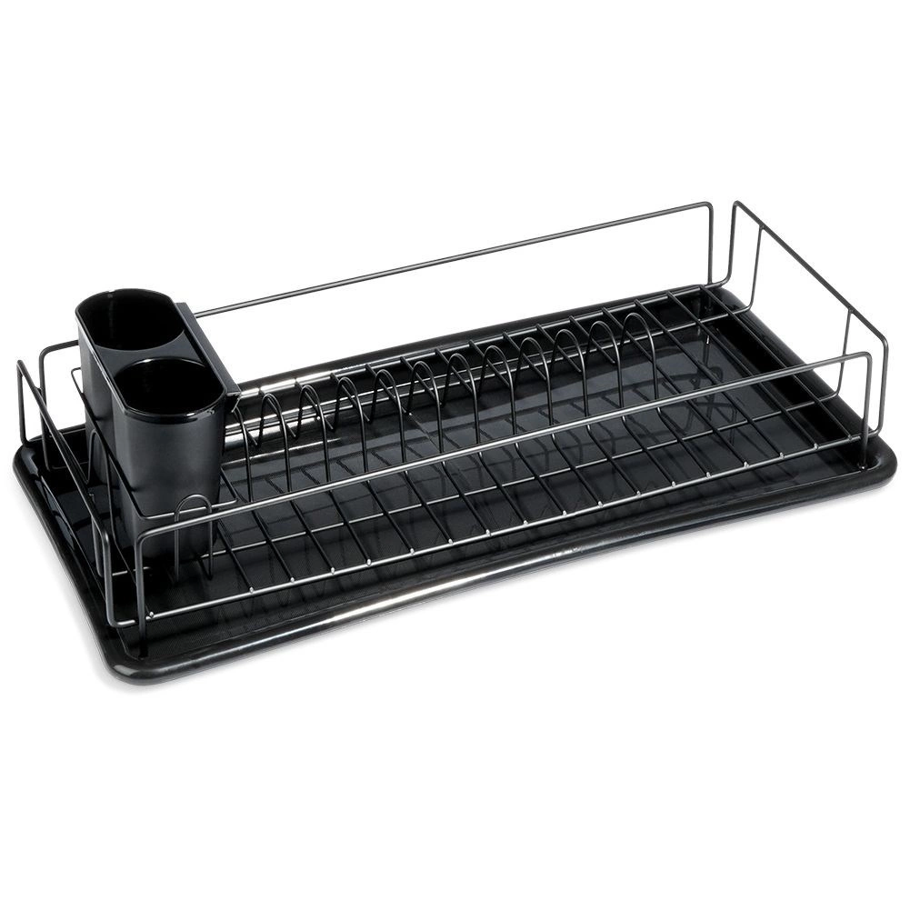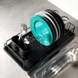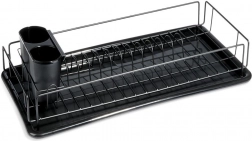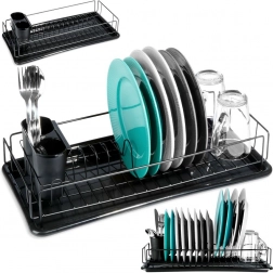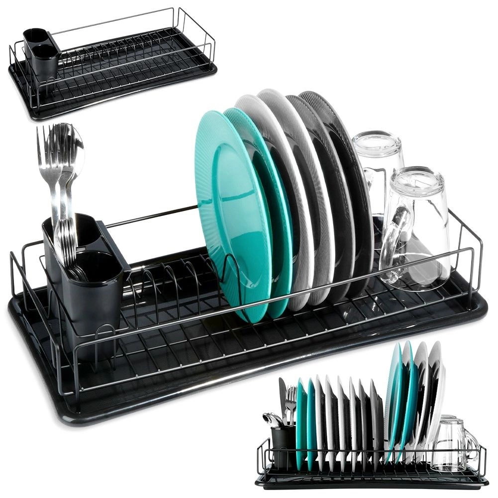 Eleganten in kompakten odcejalnik za posodo v črni barvi je praktičen dodatek vsake kuhinje. Zahvaljujoč trdnemu kovinskemu okviru in odstranljivi plastični odcejalni posodi bo vaša delovna površina ostala čista in suha. Premišljena razporeditev z držali za krožnike ter prostorom za skodelice zagotavlja hitro in higiensko sušenje.